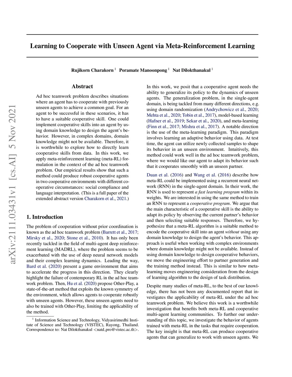 Ad hoc teamwork problem describes situations where an agent has to cooperate with previously unseen agents to achieve a common goal. For an agent to be successful in these scenarios, it has to have a suitable cooperative skill. One could implement cooperative skills into an agent by using domain knowledge to design the agent's behavior. However, in complex domains, domain knowledge might not be available. Therefore, it is worthwhile to explore how to directly learn cooperative skills from data. In this work, we apply meta-reinforcement learning (meta-RL) formulation in the context of the ad hoc teamwork problem. Our empirical results show that such a method could produce robust cooperative agents in two cooperative environments with different cooperative circumstances: social compliance and language interpretation. (This is a full paper of the extended abstract version.)