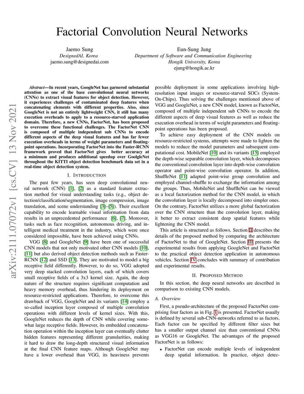 In recent years, GoogleNet has garnered substantial attention as one of the base convolutional neural networks (CNNs) to extract visual features for object detection. However, it experiences challenges of contaminated deep features when concatenating elements with different properties. Also, since GoogleNet is not an entirely lightweight CNN, it still has many execution overheads to apply to a resource-starved application domain. Therefore, a new CNNs, FactorNet, has been proposed to overcome these functional challenges. The FactorNet CNN is composed of multiple independent sub CNNs to encode different aspects of the deep visual features and has far fewer execution overheads in terms of weight parameters and floating-point operations. Incorporating FactorNet into the Faster-RCNN framework proved that FactorNet gives \ignore{a 5\%} better accuracy at a minimum and produces additional speedup over GoolgleNet throughout the KITTI object detection benchmark data set in a real-time object detection system.
