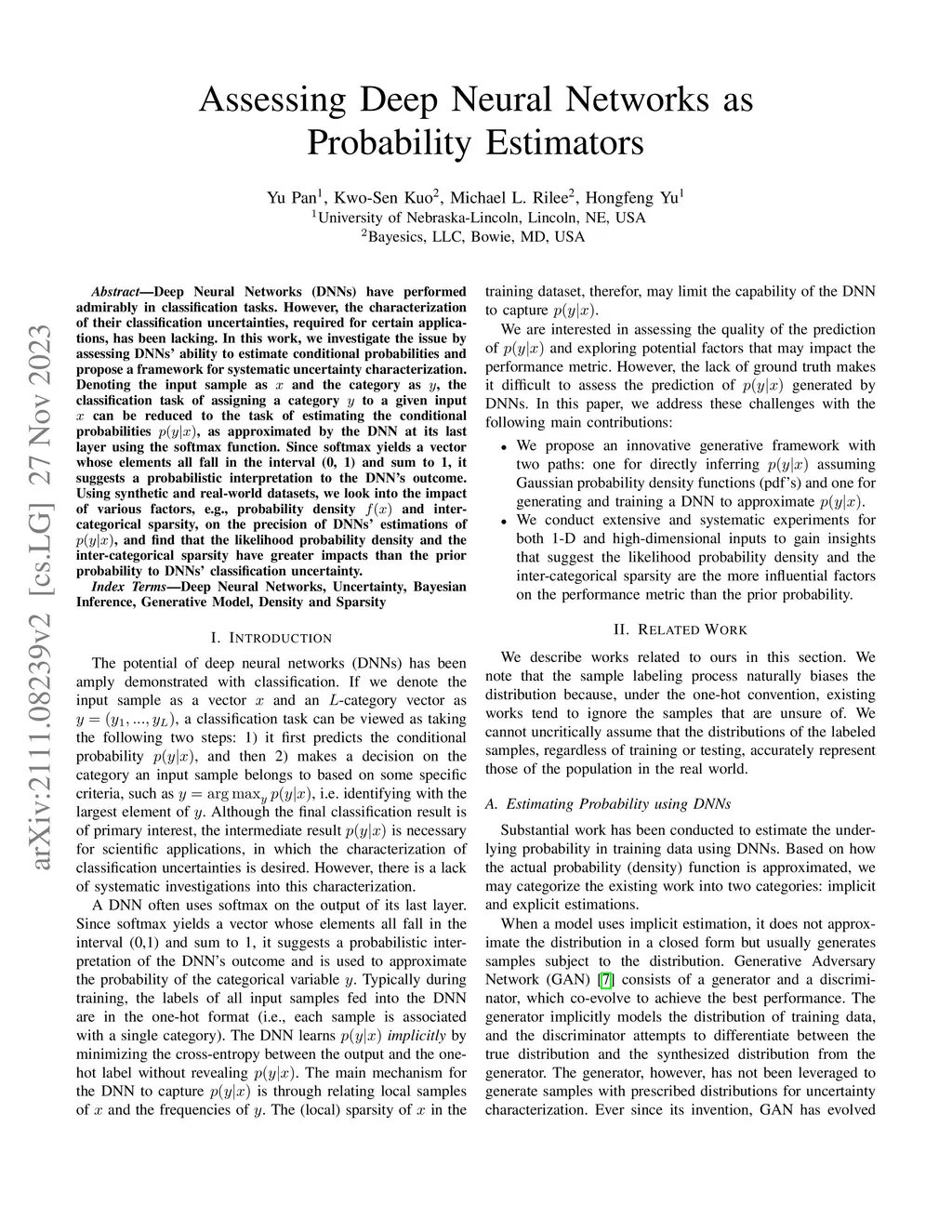 Deep Neural Networks (DNNs) have performed admirably in classification tasks. However, the characterization of their classification uncertainties, required for certain applications, has been lacking. In this work, we investigate the issue by assessing DNNs' ability to estimate conditional probabilities and propose a framework for systematic uncertainty characterization. Denoting the input sample as x and the category as y, the classification task of assigning a category y to a given input x can be reduced to the task of estimating the conditional probabilities p(y|x), as approximated by the DNN at its last layer using the softmax function. Since softmax yields a vector whose elements all fall in the interval (0, 1) and sum to 1, it suggests a probabilistic interpretation to the DNN's outcome. Using synthetic and real-world datasets, we look into the impact of various factors, e.g., probability density f(x) and inter-categorical sparsity, on the precision of DNNs' estimations of p(y|x), and find that the likelihood probability density and the inter-categorical sparsity have greater impacts than the prior probability to DNNs' classification uncertainty.