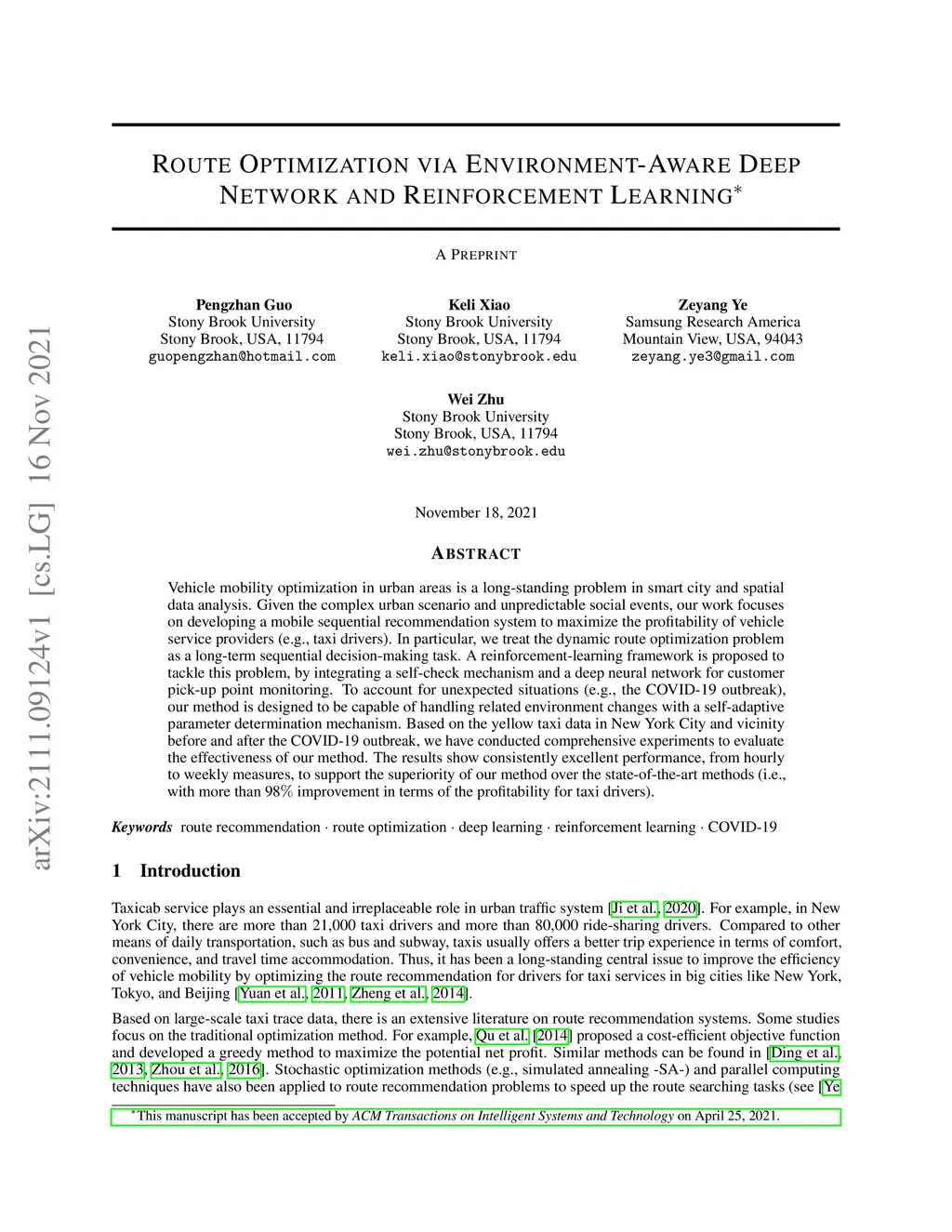Route Optimization via Environment-Aware Deep Network and Reinforcement