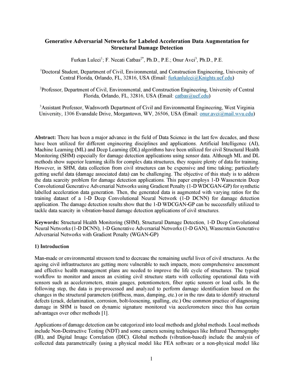 There has been a major advance in the field of Data Science in the last few decades, and these have been utilized for different engineering disciplines and applications. Artificial Intelligence (AI), Machine Learning (ML) and Deep Learning (DL) algorithms have been utilized for civil Structural Health Monitoring (SHM) especially for damage detection applications using sensor data. Although ML and DL methods show superior learning skills for complex data structures, they require plenty of data for training. However, in SHM, data collection from civil structures can be expensive and time taking; particularly getting useful data (damage associated data) can be challenging. The objective of this study is to address the data scarcity problem for damage detection applications. This paper employs 1-D Wasserstein Deep Convolutional Generative Adversarial Networks using Gradient Penalty (1-D WDCGAN-GP) for synthetic labelled acceleration data generation. Then, the generated data is augmented with varying ratios for the training dataset of a 1-D Deep Convolutional Neural Network (1-D DCNN) for damage detection application. The damage detection results show that the 1-D WDCGAN-GP can be successfully utilized to tackle data scarcity in vibration-based damage detection applications of civil structures. Keywords: Structural Health Monitoring (SHM), Structural Damage Detection, 1-D Deep Convolutional Neural Networks (1-D DCNN), 1-D Generative Adversarial Networks (1-D GAN), Wasserstein Generative Adversarial Networks with Gradient Penalty (WGAN-GP)
