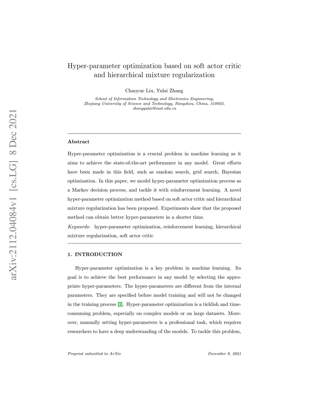 Hyper-parameter optimization is a crucial problem in machine learning as it aims to achieve the state-of-the-art performance in any model. Great efforts have been made in this field, such as random search, grid search, Bayesian optimization. In this paper, we model hyper-parameter optimization process as a Markov decision process, and tackle it with reinforcement learning. A novel hyper-parameter optimization method based on soft actor critic and hierarchical mixture regularization has been proposed. Experiments show that the proposed method can obtain better hyper-parameters in a shorter time.