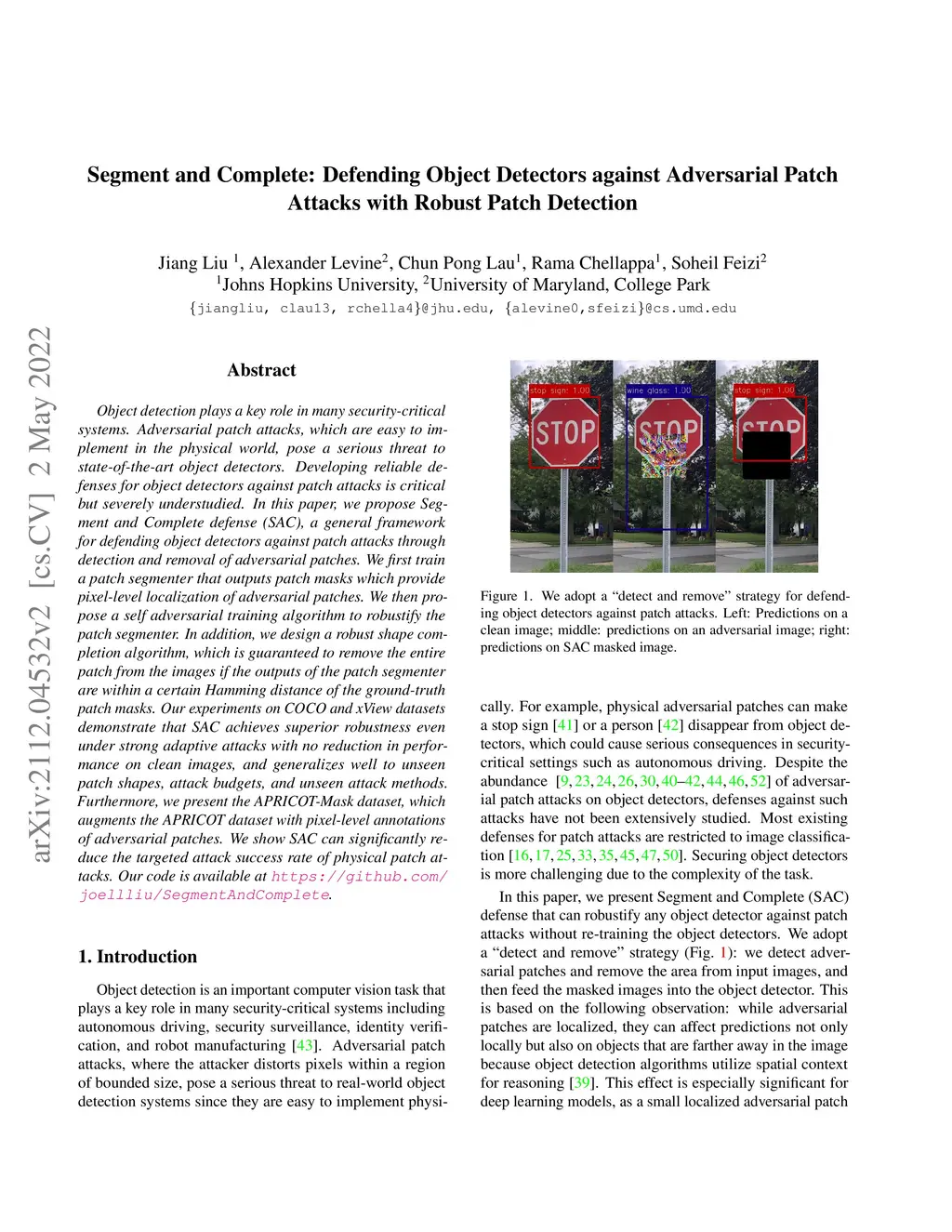 Object detection plays a key role in many security-critical systems. Adversarial patch attacks, which are easy to implement in the physical world, pose a serious threat to state-of-the-art object detectors. Developing reliable defenses for object detectors against patch attacks is critical but severely understudied. In this paper, we propose Segment and Complete defense (SAC), a general framework for defending object detectors against patch attacks through detection and removal of adversarial patches. We first train a patch segmenter that outputs patch masks which provide pixel-level localization of adversarial patches. We then propose a self adversarial training algorithm to robustify the patch segmenter. In addition, we design a robust shape completion algorithm, which is guaranteed to remove the entire patch from the images if the outputs of the patch segmenter are within a certain Hamming distance of the ground-truth patch masks. Our experiments on COCO and xView datasets demonstrate that SAC achieves superior robustness even under strong adaptive attacks with no reduction in performance on clean images, and generalizes well to unseen patch shapes, attack budgets, and unseen attack methods. Furthermore, we present the APRICOT-Mask dataset, which augments the APRICOT dataset with pixel-level annotations of adversarial patches. We show SAC can significantly reduce the targeted attack success rate of physical patch attacks. Our code is available at https://github.com/joellliu/SegmentAndComplete.