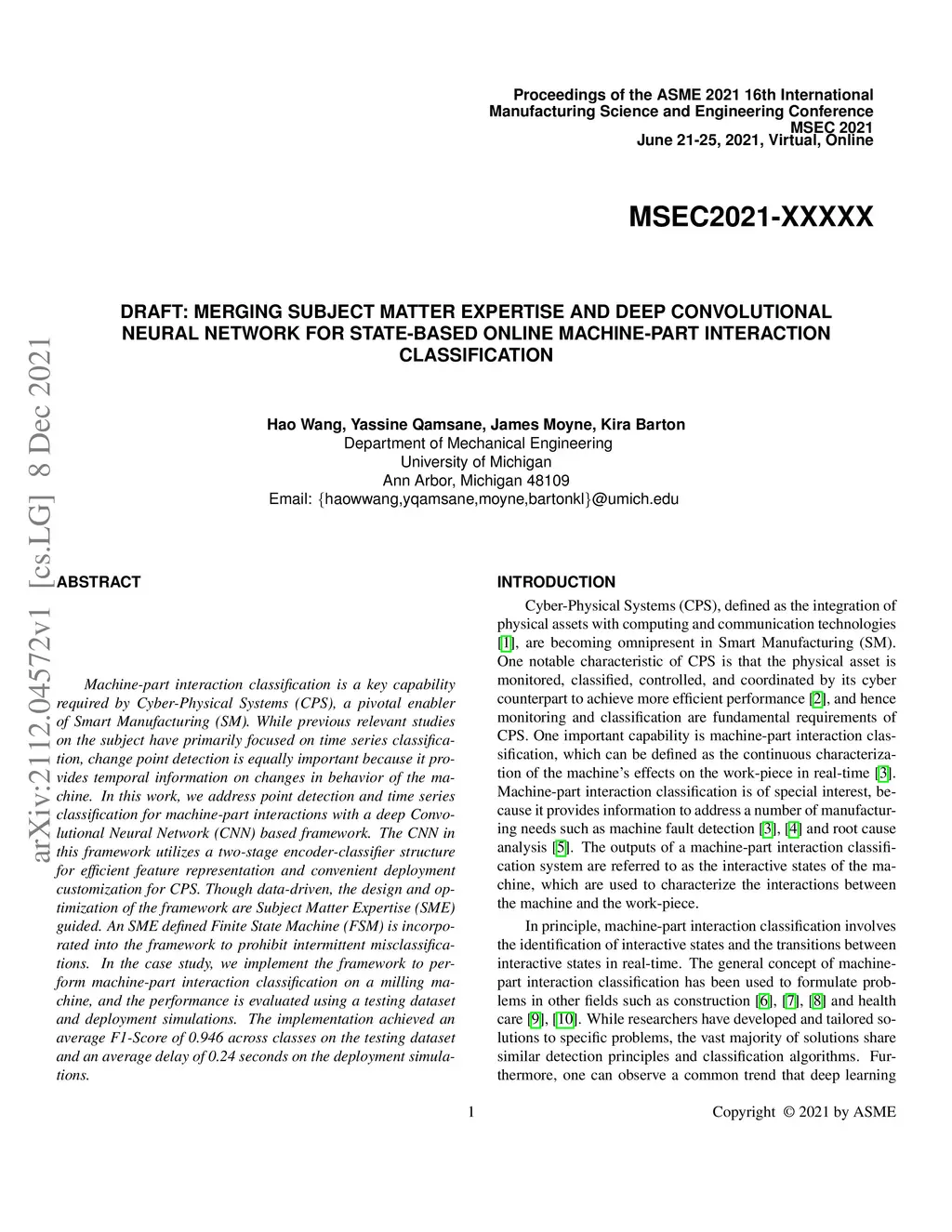 Machine-part interaction classification is a key capability required by Cyber-Physical Systems (CPS), a pivotal enabler of Smart Manufacturing (SM). While previous relevant studies on the subject have primarily focused on time series classification, change point detection is equally important because it provides temporal information on changes in behavior of the machine. In this work, we address point detection and time series classification for machine-part interactions with a deep Convolutional Neural Network (CNN) based framework. The CNN in this framework utilizes a two-stage encoder-classifier structure for efficient feature representation and convenient deployment customization for CPS. Though data-driven, the design and optimization of the framework are Subject Matter Expertise (SME) guided. An SME defined Finite State Machine (FSM) is incorporated into the framework to prohibit intermittent misclassifications. In the case study, we implement the framework to perform machine-part interaction classification on a milling machine, and the performance is evaluated using a testing dataset and deployment simulations. The implementation achieved an average F1-Score of 0.946 across classes on the testing dataset and an average delay of 0.24 seconds on the deployment simulations.