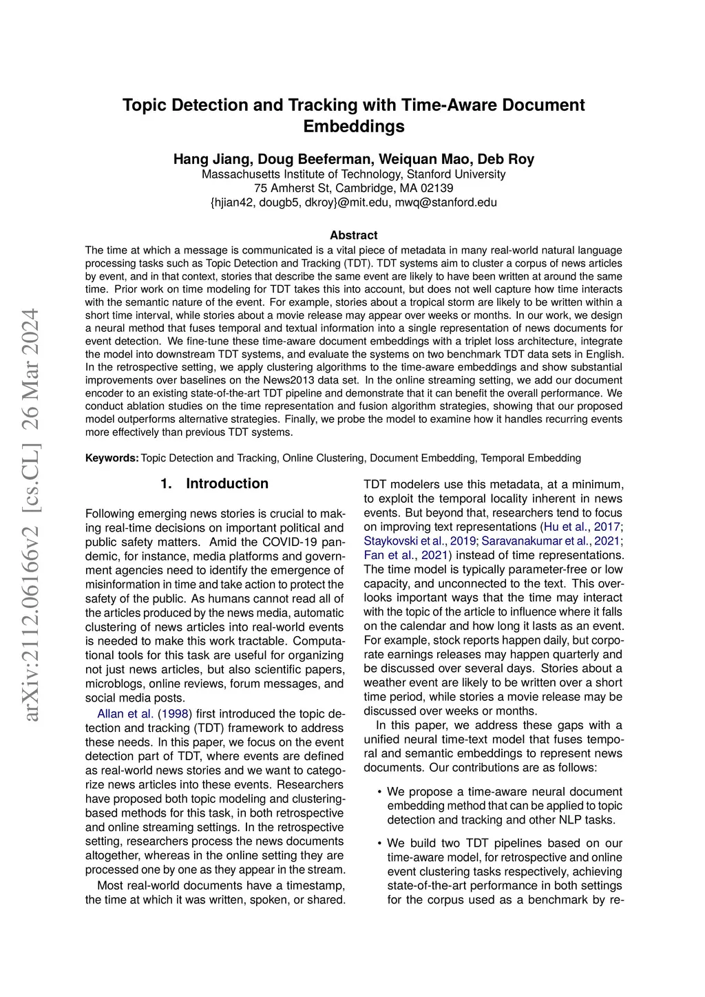 Topic Detection and Tracking with Time-Aware Document Embeddings