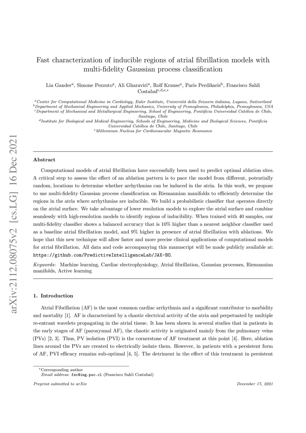 Computational models of atrial fibrillation have successfully been used to predict optimal ablation sites. A critical step to assess the effect of an ablation pattern is to pace the model from different, potentially random, locations to determine whether arrhythmias can be induced in the atria. In this work, we propose to use multi-fidelity Gaussian process classification on Riemannian manifolds to efficiently determine the regions in the atria where arrhythmias are inducible. We build a probabilistic classifier that operates directly on the atrial surface. We take advantage of lower resolution models to explore the atrial surface and combine seamlessly with high-resolution models to identify regions of inducibility. When trained with 40 samples, our multi-fidelity classifier shows a balanced accuracy that is 10% higher than a nearest neighbor classifier used as a baseline atrial fibrillation model, and 9% higher in presence of atrial fibrillation with ablations. We hope that this new technique will allow faster and more precise clinical applications of computational models for atrial fibrillation.