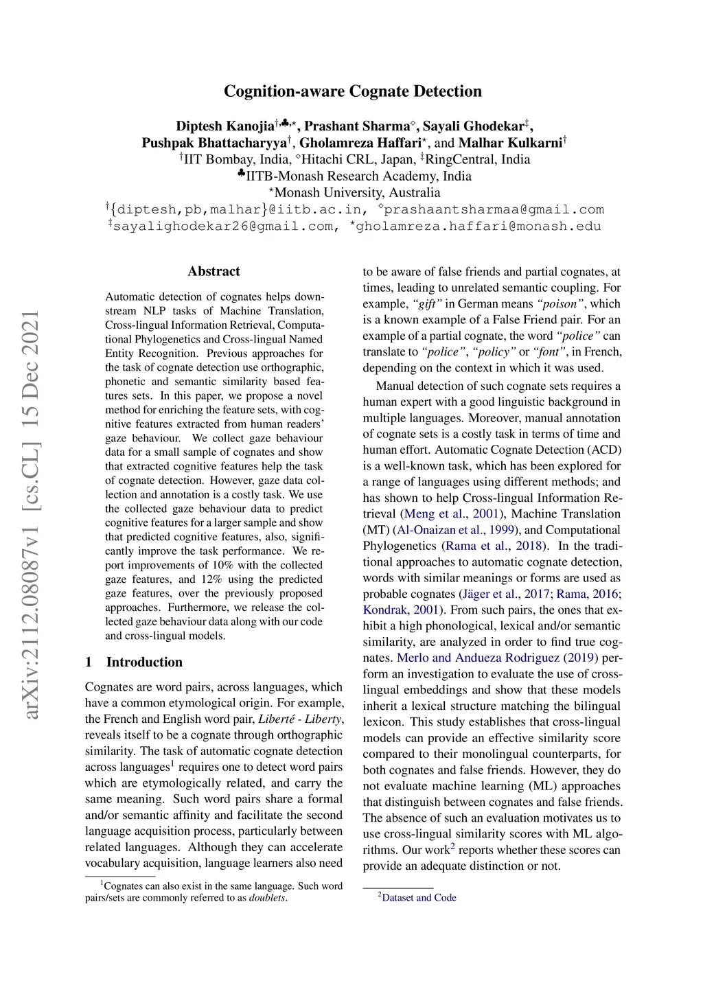 Automatic detection of cognates helps downstream NLP tasks of Machine Translation, Cross-lingual Information Retrieval, Computational Phylogenetics and Cross-lingual Named Entity Recognition. Previous approaches for the task of cognate detection use orthographic, phonetic and semantic similarity based features sets. In this paper, we propose a novel method for enriching the feature sets, with cognitive features extracted from human readers' gaze behaviour. We collect gaze behaviour data for a small sample of cognates and show that extracted cognitive features help the task of cognate detection. However, gaze data collection and annotation is a costly task. We use the collected gaze behaviour data to predict cognitive features for a larger sample and show that predicted cognitive features, also, significantly improve the task performance. We report improvements of 10% with the collected gaze features, and 12% using the predicted gaze features, over the previously proposed approaches. Furthermore, we release the collected gaze behaviour data along with our code and cross-lingual models.