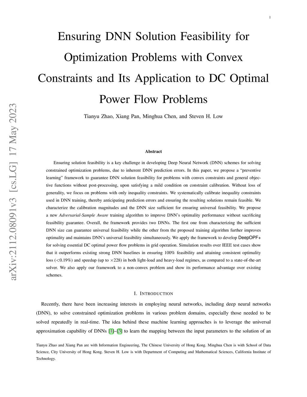 Ensuring solution feasibility is a key challenge in developing Deep Neural Network (DNN) schemes for solving constrained optimization problems, due to inherent DNN prediction errors. In this paper, we propose a ``preventive learning'' framework to guarantee DNN solution feasibility for problems with convex constraints and general objective functions without post-processing, upon satisfying a mild condition on constraint calibration. Without loss of generality, we focus on problems with only inequality constraints. We systematically calibrate inequality constraints used in DNN training, thereby anticipating prediction errors and ensuring the resulting solutions remain feasible. We characterize the calibration magnitudes and the DNN size sufficient for ensuring universal feasibility. We propose a new Adversarial-Sample Aware training algorithm to improve DNN's optimality performance without sacrificing feasibility guarantee. Overall, the framework provides two DNNs. The first one from characterizing the sufficient DNN size can guarantee universal feasibility while the other from the proposed training algorithm further improves optimality and maintains DNN's universal feasibility simultaneously. We apply the framework to develop DeepOPF+ for solving essential DC optimal power flow problems in grid operation. Simulation results over IEEE test cases show that it outperforms existing strong DNN baselines in ensuring 100% feasibility and attaining consistent optimality loss (0.19%) and speedup (up to 228) in both light-load and heavy-load regimes, as compared to a state-of-the-art solver. We also apply our framework to a non-convex problem and show its performance advantage over existing schemes.