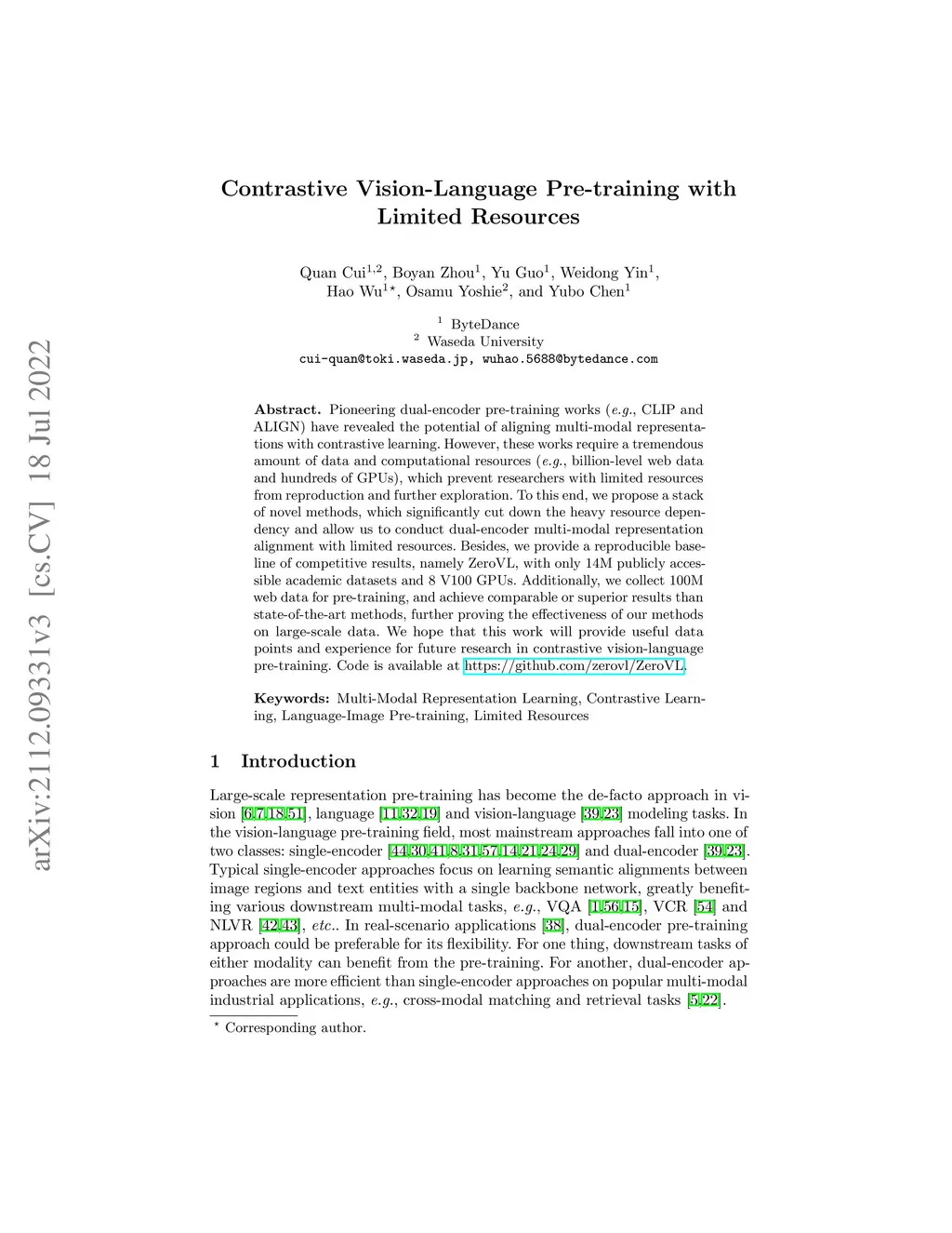 Pioneering dual-encoder pre-training works (e.g., CLIP and ALIGN) have revealed the potential of aligning multi-modal representations with contrastive learning. However, these works require a tremendous amount of data and computational resources (e.g., billion-level web data and hundreds of GPUs), which prevent researchers with limited resources from reproduction and further exploration. To this end, we propose a stack of novel methods, which significantly cut down the heavy resource dependency and allow us to conduct dual-encoder multi-modal representation alignment with limited resources. Besides, we provide a reproducible baseline of competitive results, namely ZeroVL, with only 14M publicly accessible academic datasets and 8 V100 GPUs. Additionally, we collect 100M web data for pre-training, and achieve comparable or superior results than state-of-the-art methods, further proving the effectiveness of our methods on large-scale data. We hope that this work will provide useful data points and experience for future research in contrastive vision-language pre-training. Code is available at https://github.com/zerovl/ZeroVL.
