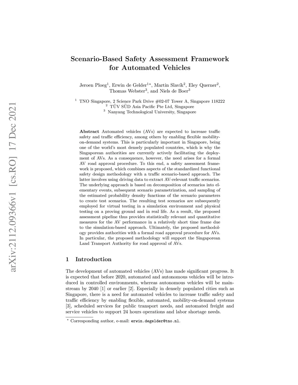 Automated vehicles (AVs) are expected to increase traffic safety and traffic efficiency, among others by enabling flexible mobility-on-demand systems. This is particularly important in Singapore, being one of the world's most densely populated countries, which is why the Singaporean authorities are currently actively facilitating the deployment of AVs. As a consequence, however, the need arises for a formal AV road approval procedure. To this end, a safety assessment framework is proposed, which combines aspects of the standardized functional safety design methodology with a traffic scenario-based approach. The latter involves using driving data to extract AV-relevant traffic scenarios. The underlying approach is based on decomposition of scenarios into elementary events, subsequent scenario parametrization, and sampling of the estimated probability density functions of the scenario parameters to create test scenarios. The resulting test scenarios are subsequently employed for virtual testing in a simulation environment and physical testing on a proving ground and in real life. As a result, the proposed assessment pipeline thus provides statistically relevant and quantitative measures for the AV performance in a relatively short time frame due to the simulation-based approach. Ultimately, the proposed methodology provides authorities with a formal road approval procedure for AVs. In particular, the proposed methodology will support the Singaporean Land Transport Authority for road approval of AVs.