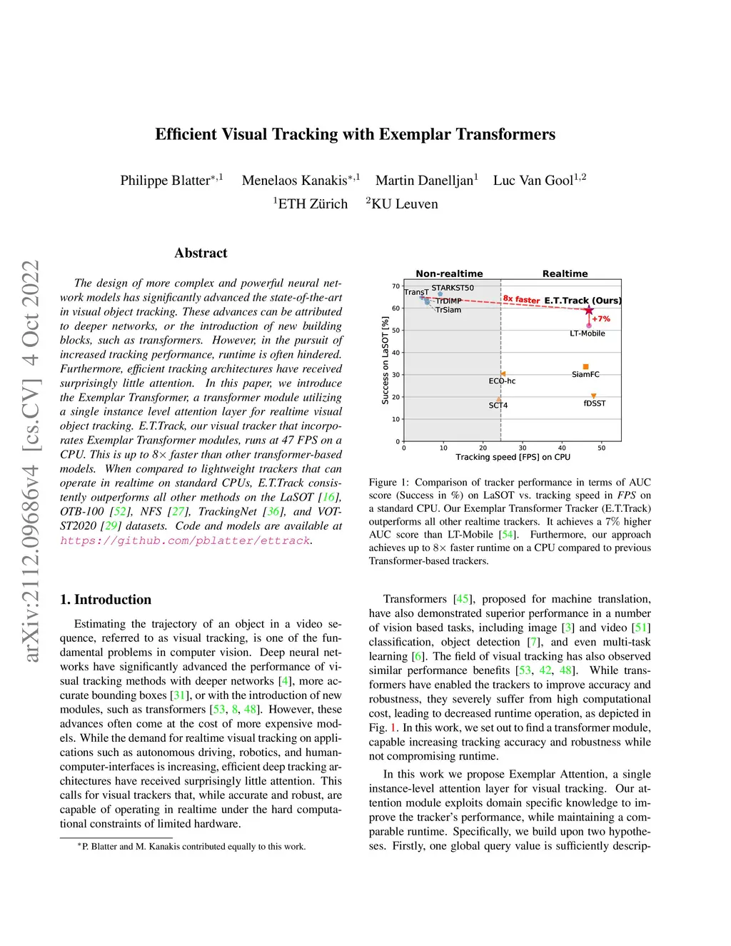 The design of more complex and powerful neural network models has significantly advanced the state-of-the-art in visual object tracking. These advances can be attributed to deeper networks, or the introduction of new building blocks, such as transformers. However, in the pursuit of increased tracking performance, runtime is often hindered. Furthermore, efficient tracking architectures have received surprisingly little attention. In this paper, we introduce the Exemplar Transformer, a transformer module utilizing a single instance level attention layer for realtime visual object tracking. E.T.Track, our visual tracker that incorporates Exemplar Transformer modules, runs at 47 FPS on a CPU. This is up to 8x faster than other transformer-based models. When compared to lightweight trackers that can operate in realtime on standard CPUs, E.T.Track consistently outperforms all other methods on the LaSOT, OTB-100, NFS, TrackingNet, and VOT-ST2020 datasets. Code and models are available at https://github.com/pblatter/ettrack.