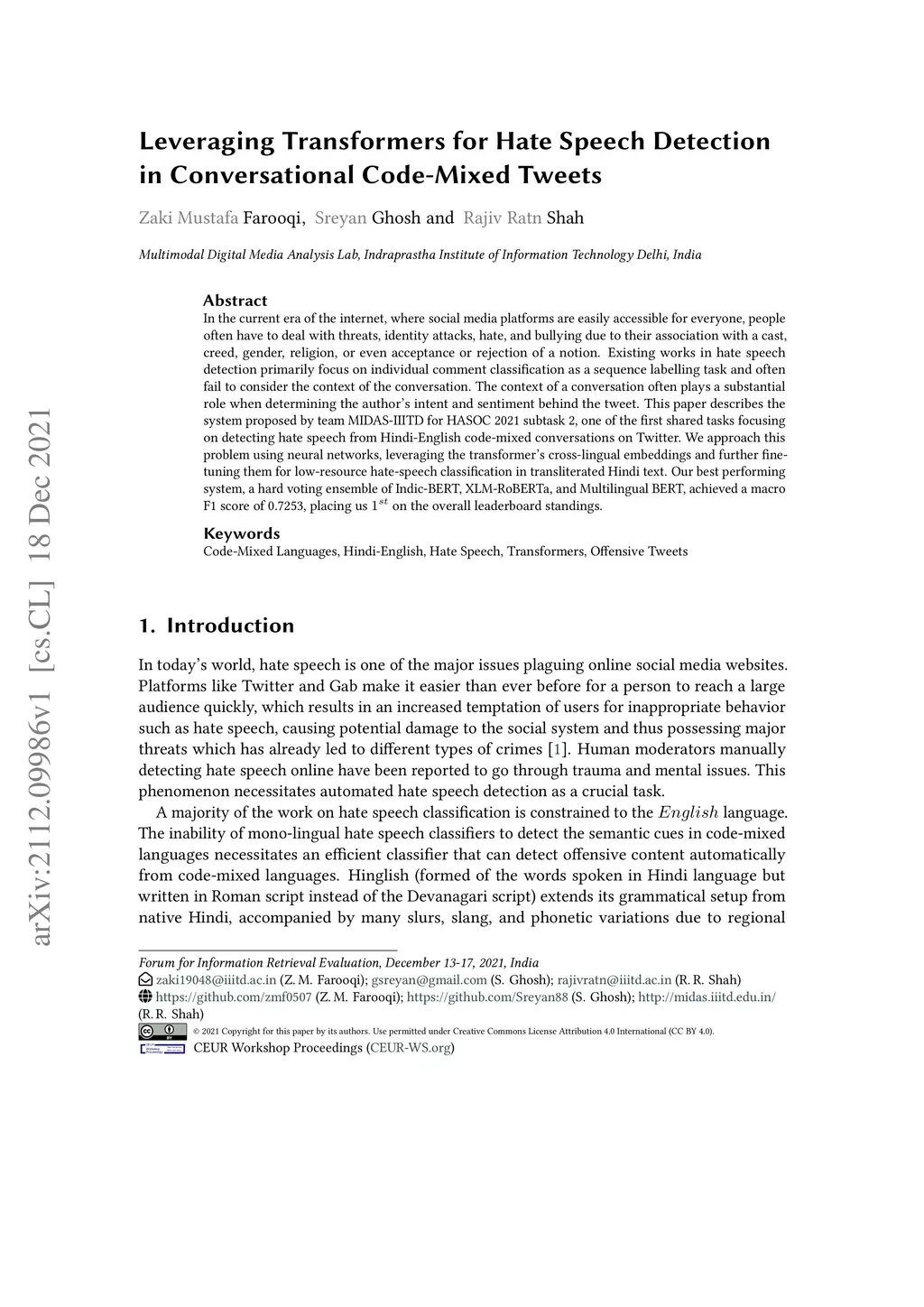 In the current era of the internet, where social media platforms are easily accessible for everyone, people often have to deal with threats, identity attacks, hate, and bullying due to their association with a cast, creed, gender, religion, or even acceptance or rejection of a notion. Existing works in hate speech detection primarily focus on individual comment classification as a sequence labeling task and often fail to consider the context of the conversation. The context of a conversation often plays a substantial role when determining the author's intent and sentiment behind the tweet. This paper describes the system proposed by team MIDAS-IIITD for HASOC 2021 subtask 2, one of the first shared tasks focusing on detecting hate speech from Hindi-English code-mixed conversations on Twitter. We approach this problem using neural networks, leveraging the transformer's cross-lingual embeddings and further finetuning them for low-resource hate-speech classification in transliterated Hindi text. Our best performing system, a hard voting ensemble of Indic-BERT, XLM-RoBERTa, and Multilingual BERT, achieved a macro F1 score of 0.7253, placing us first on the overall leaderboard standings.