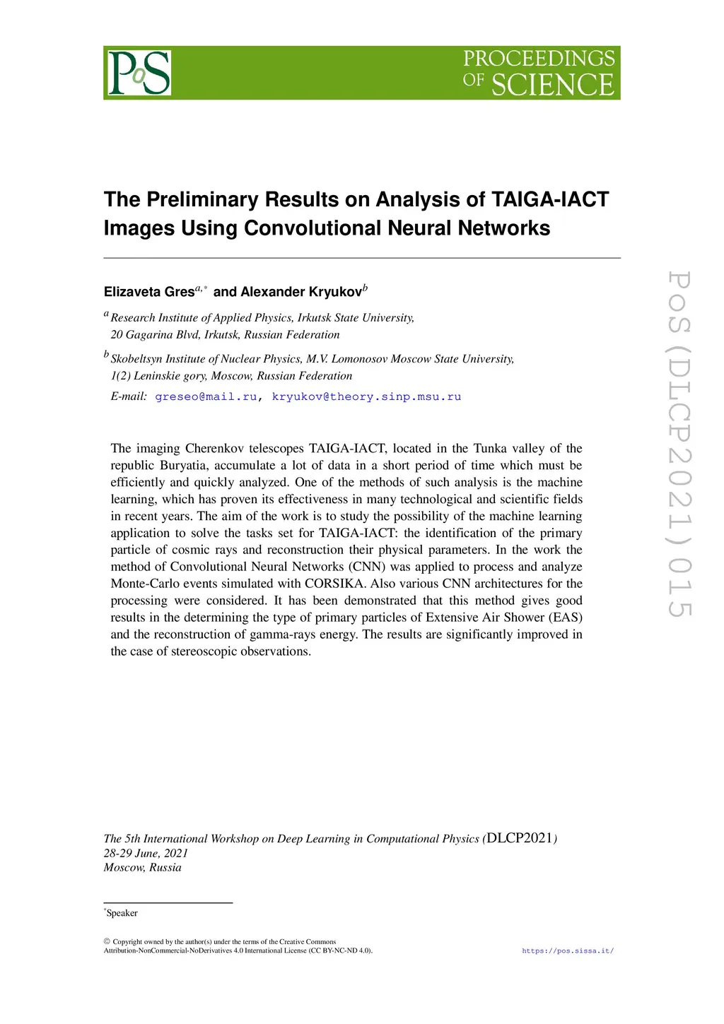 The imaging Cherenkov telescopes TAIGA-IACT, located in the Tunka valley of the republic Buryatia, accumulate a lot of data in a short period of time which must be efficiently and quickly analyzed. One of the methods of such analysis is the machine learning, which has proven its effectiveness in many technological and scientific fields in recent years. The aim of the work is to study the possibility of the machine learning application to solve the tasks set for TAIGA-IACT: the identification of the primary particle of cosmic rays and reconstruction their physical parameters. In the work the method of Convolutional Neural Networks (CNN) was applied to process and analyze Monte-Carlo events simulated with CORSIKA. Also various CNN architectures for the processing were considered. It has been demonstrated that this method gives good results in the determining the type of primary particles of Extensive Air Shower (EAS) and the reconstruction of gamma-rays energy. The results are significantly improved in the case of stereoscopic observations.