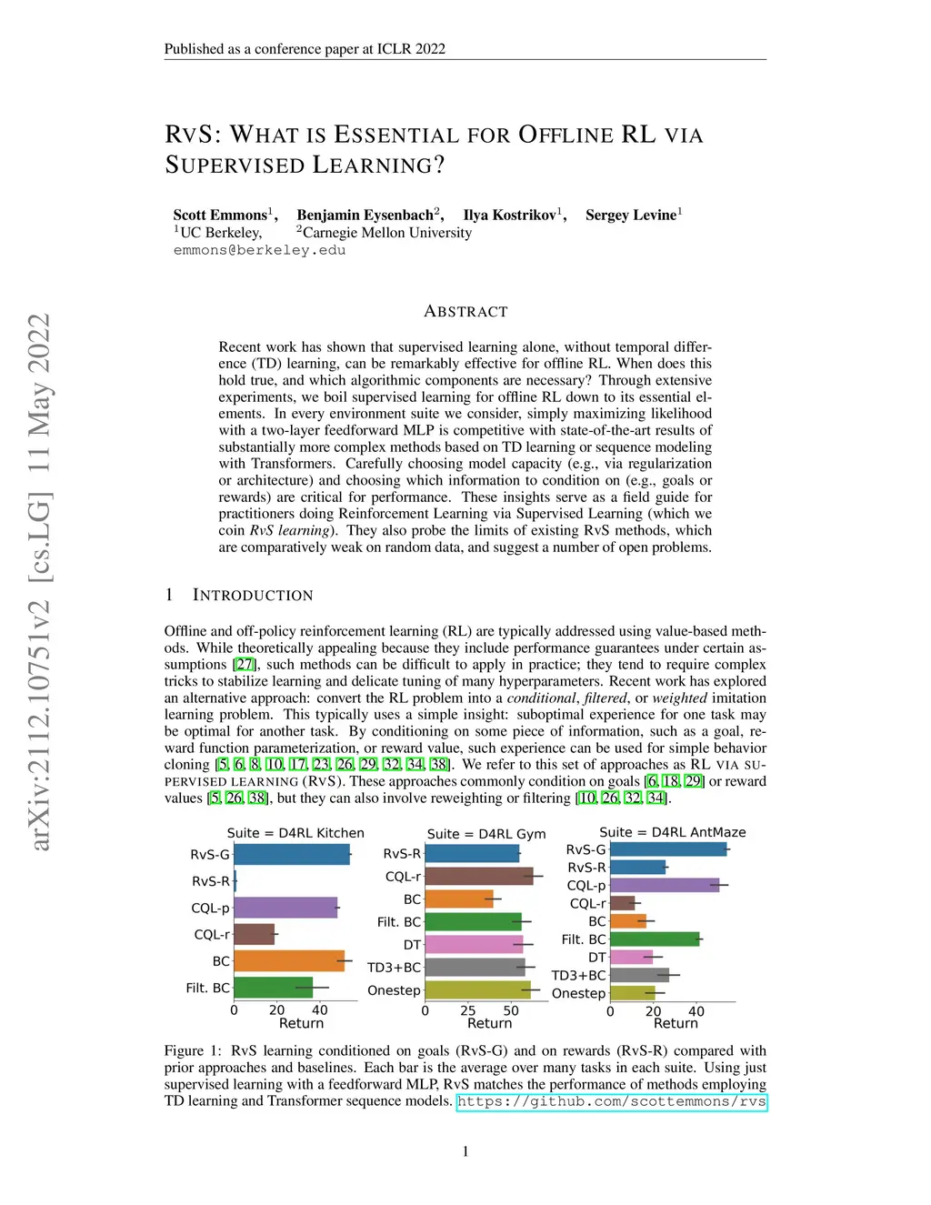 Recent work has shown that supervised learning alone, without temporal difference (TD) learning, can be remarkably effective for offline RL. When does this hold true, and which algorithmic components are necessary? Through extensive experiments, we boil supervised learning for offline RL down to its essential elements. In every environment suite we consider, simply maximizing likelihood with a two-layer feedforward MLP is competitive with state-of-the-art results of substantially more complex methods based on TD learning or sequence modeling with Transformers. Carefully choosing model capacity (e.g., via regularization or architecture) and choosing which information to condition on (e.g., goals or rewards) are critical for performance. These insights serve as a field guide for practitioners doing Reinforcement Learning via Supervised Learning (which we coin "RvS learning"). They also probe the limits of existing RvS methods, which are comparatively weak on random data, and suggest a number of open problems.