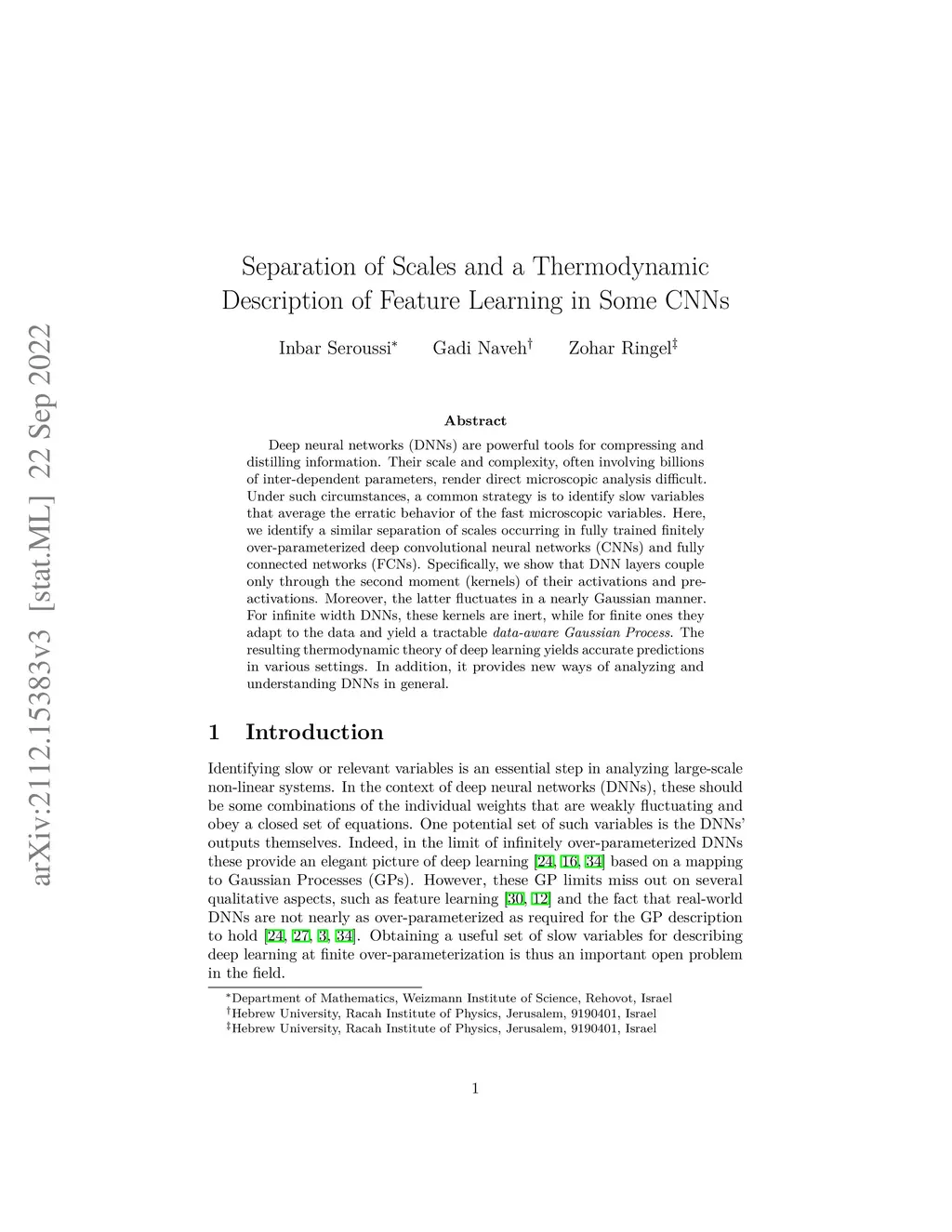 Deep neural networks (DNNs) are powerful tools for compressing and distilling information. Their scale and complexity, often involving billions of inter-dependent parameters, render direct microscopic analysis difficult. Under such circumstances, a common strategy is to identify slow variables that average the erratic behavior of the fast microscopic variables. Here, we identify a similar separation of scales occurring in fully trained finitely over-parameterized deep convolutional neural networks (CNNs) and fully connected networks (FCNs). Specifically, we show that DNN layers couple only through the second moment (kernels) of their activations and pre-activations. Moreover, the latter fluctuates in a nearly Gaussian manner. For infinite width DNNs, these kernels are inert, while for finite ones they adapt to the data and yield a tractable data-aware Gaussian Process. The resulting thermodynamic theory of deep learning yields accurate predictions in various settings. In addition, it provides new ways of analyzing and understanding DNNs in general.