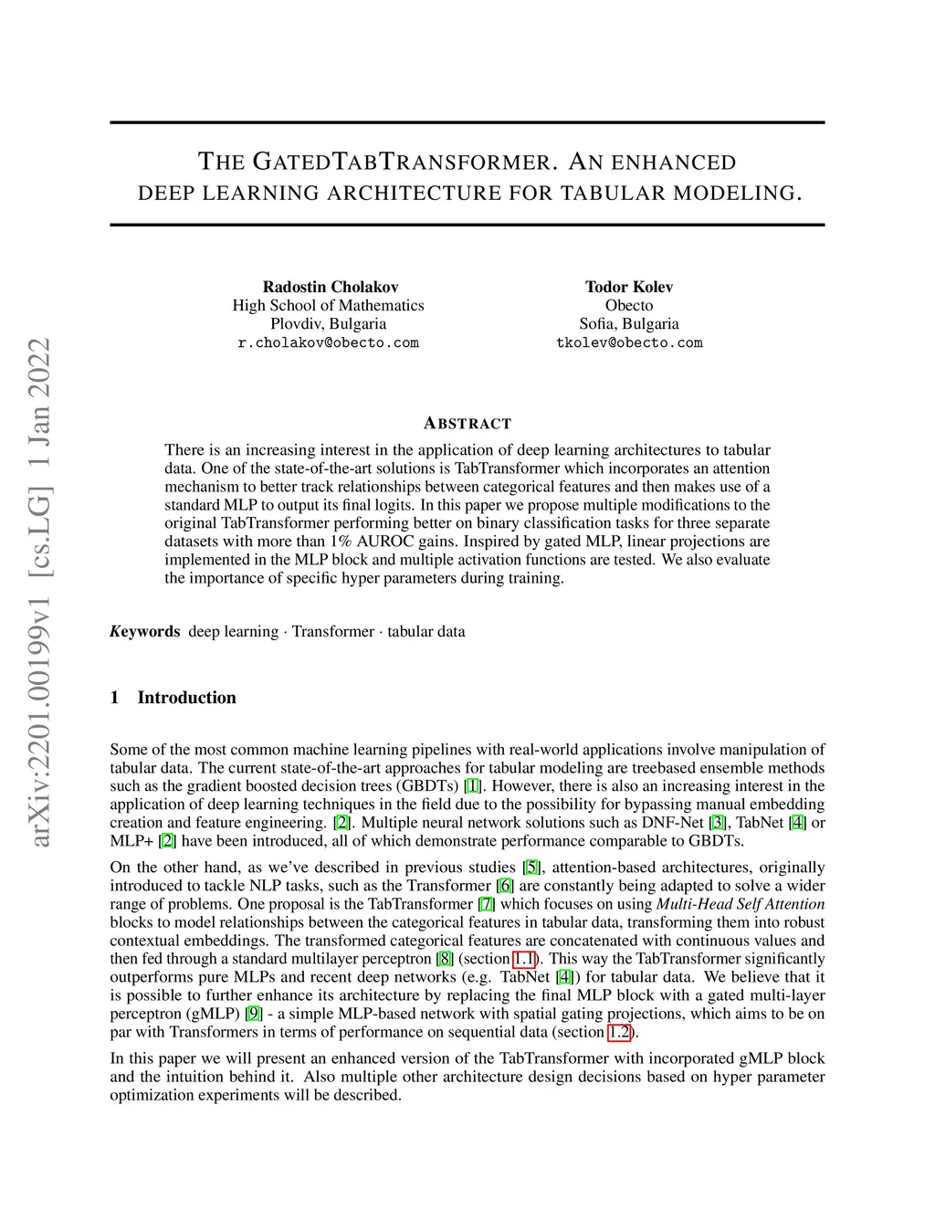 There is an increasing interest in the application of deep learning architectures to tabular data. One of the state-of-the-art solutions is TabTransformer which incorporates an attention mechanism to better track relationships between categorical features and then makes use of a standard MLP to output its final logits. In this paper we propose multiple modifications to the original TabTransformer performing better on binary classification tasks for three separate datasets with more than 1% AUROC gains. Inspired by gated MLP, linear projections are implemented in the MLP block and multiple activation functions are tested. We also evaluate the importance of specific hyper parameters during training.
