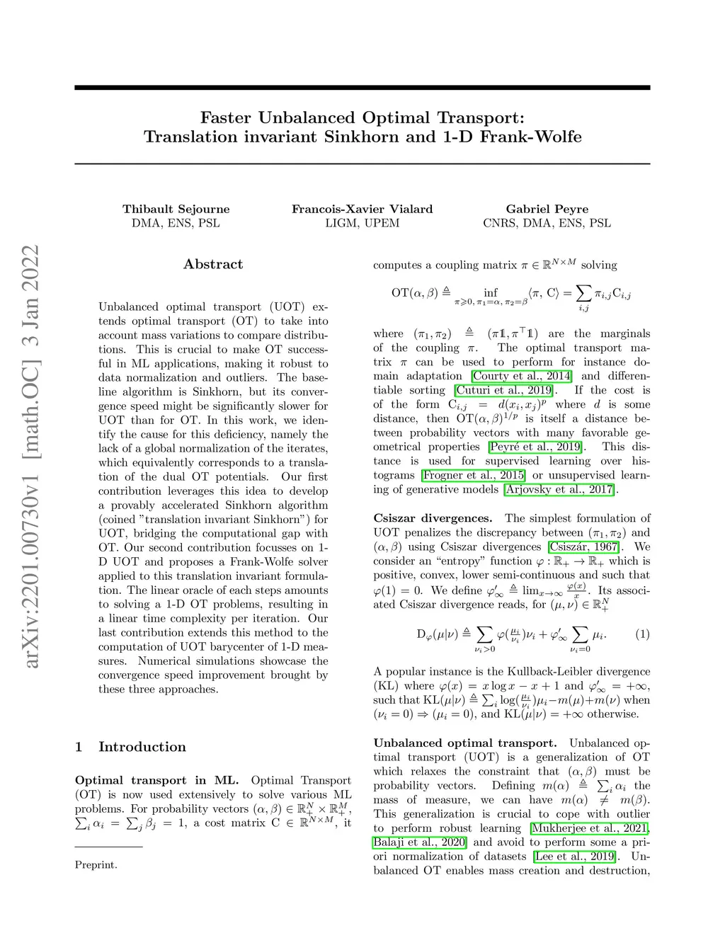 Unbalanced optimal transport (UOT) extends optimal transport (OT) to take into account mass variations to compare distributions. This is crucial to make OT successful in ML applications, making it robust to data normalization and outliers. The baseline algorithm is Sinkhorn, but its convergence speed might be significantly slower for UOT than for OT. In this work, we identify the cause for this deficiency, namely the lack of a global normalization of the iterates, which equivalently corresponds to a translation of the dual OT potentials. Our first contribution leverages this idea to develop a provably accelerated Sinkhorn algorithm (coined 'translation invariant Sinkhorn') for UOT, bridging the computational gap with OT. Our second contribution focusses on 1-D UOT and proposes a Frank-Wolfe solver applied to this translation invariant formulation. The linear oracle of each steps amounts to solving a 1-D OT problems, resulting in a linear time complexity per iteration. Our last contribution extends this method to the computation of UOT barycenter of 1-D measures. Numerical simulations showcase the convergence speed improvement brought by these three approaches.