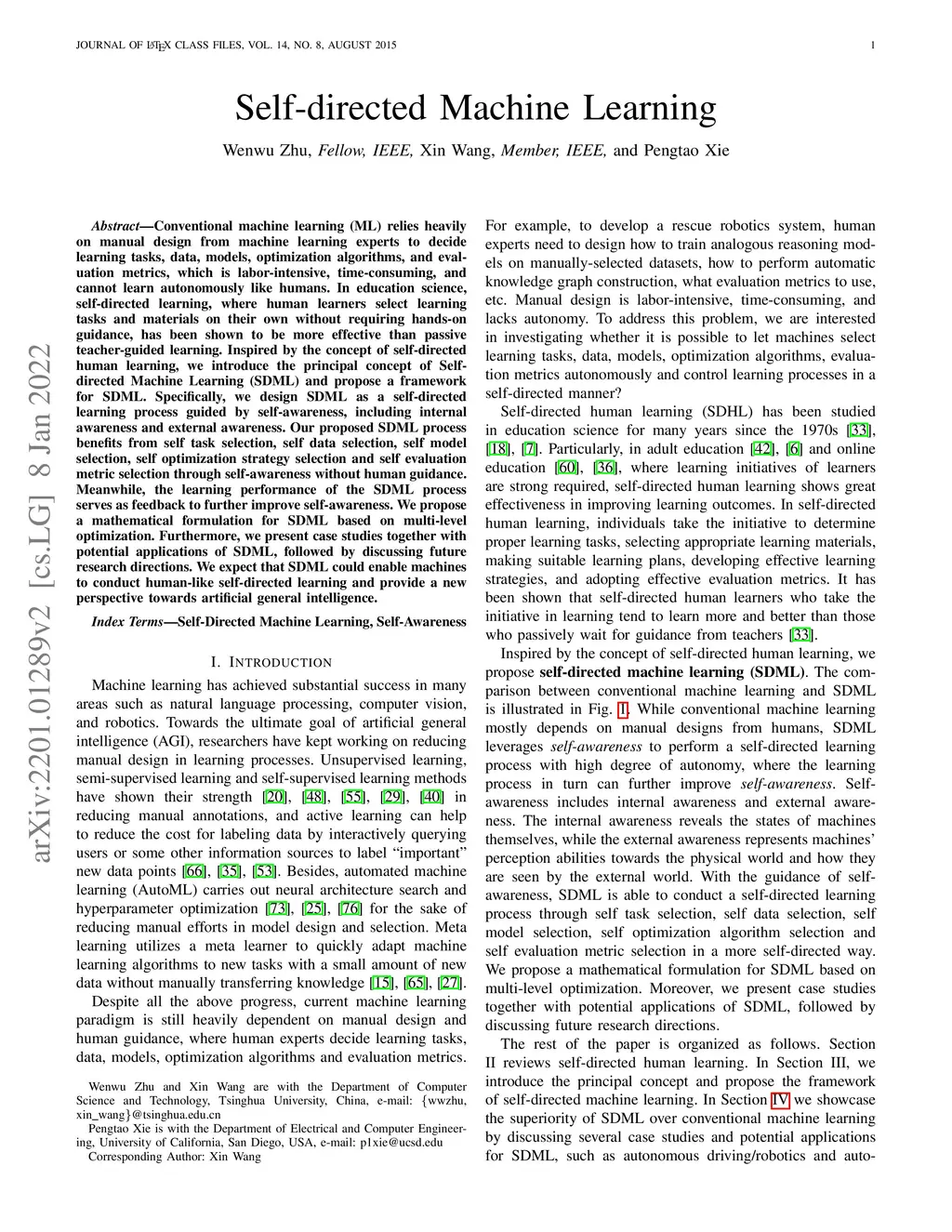 Conventional machine learning (ML) relies heavily on manual design from machine learning experts to decide learning tasks, data, models, optimization algorithms, and evaluation metrics, which is labor-intensive, time-consuming, and cannot learn autonomously like humans. In education science, self-directed learning, where human learners select learning tasks and materials on their own without requiring hands-on guidance, has been shown to be more effective than passive teacher-guided learning. Inspired by the concept of self-directed human learning, we introduce the principal concept of Self-directed Machine Learning (SDML) and propose a framework for SDML. Specifically, we design SDML as a self-directed learning process guided by self-awareness, including internal awareness and external awareness. Our proposed SDML process benefits from self task selection, self data selection, self model selection, self optimization strategy selection and self evaluation metric selection through self-awareness without human guidance. Meanwhile, the learning performance of the SDML process serves as feedback to further improve self-awareness. We propose a mathematical formulation for SDML based on multi-level optimization. Furthermore, we present case studies together with potential applications of SDML, followed by discussing future research directions. We expect that SDML could enable machines to conduct human-like self-directed learning and provide a new perspective towards artificial general intelligence.