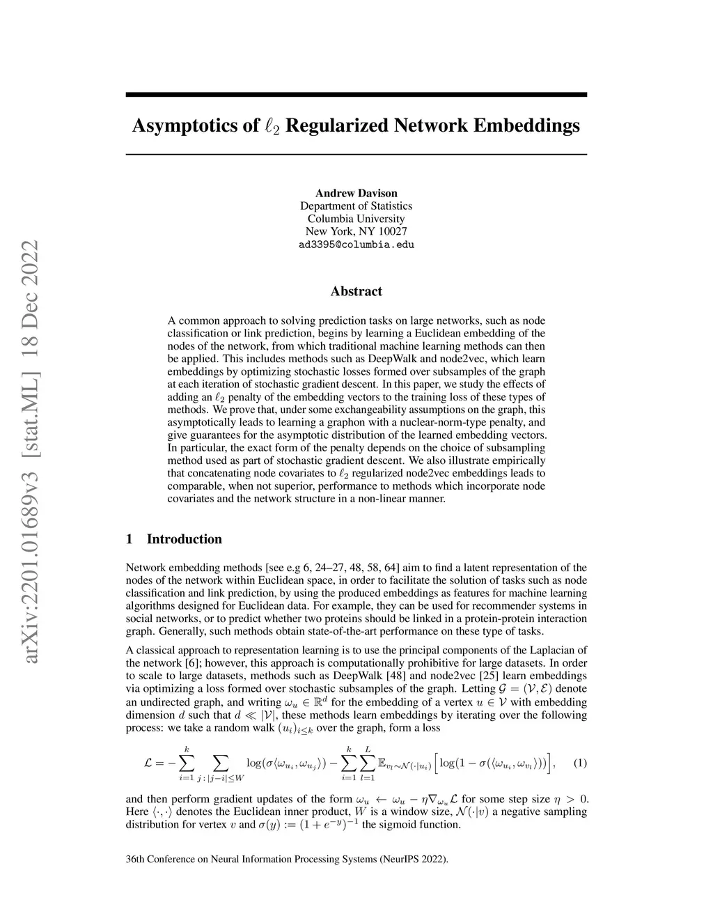 A common approach to solving prediction tasks on large networks, such as node classification or link prediction, begin by learning a Euclidean embedding of the nodes of the network, from which traditional machine learning methods can then be applied. This includes methods such as DeepWalk and node2vec, which learn embeddings by optimizing stochastic losses formed over subsamples of the graph at each iteration of stochastic gradient descent. In this paper, we study the effects of adding an penalty of the embedding vectors to the training loss of these types of methods. We prove that, under some exchangeability assumptions on the graph, this asymptotically leads to learning a graphon with a nuclear-norm-type penalty, and give guarantees for the asymptotic distribution of the learned embedding vectors. In particular, the exact form of the penalty depends on the choice of subsampling method used as part of stochastic gradient descent. We also illustrate empirically that concatenating node covariates to regularized node2vec embeddings leads to comparable, when not superior, performance to methods which incorporate node covariates and the network structure in a non-linear manner.
