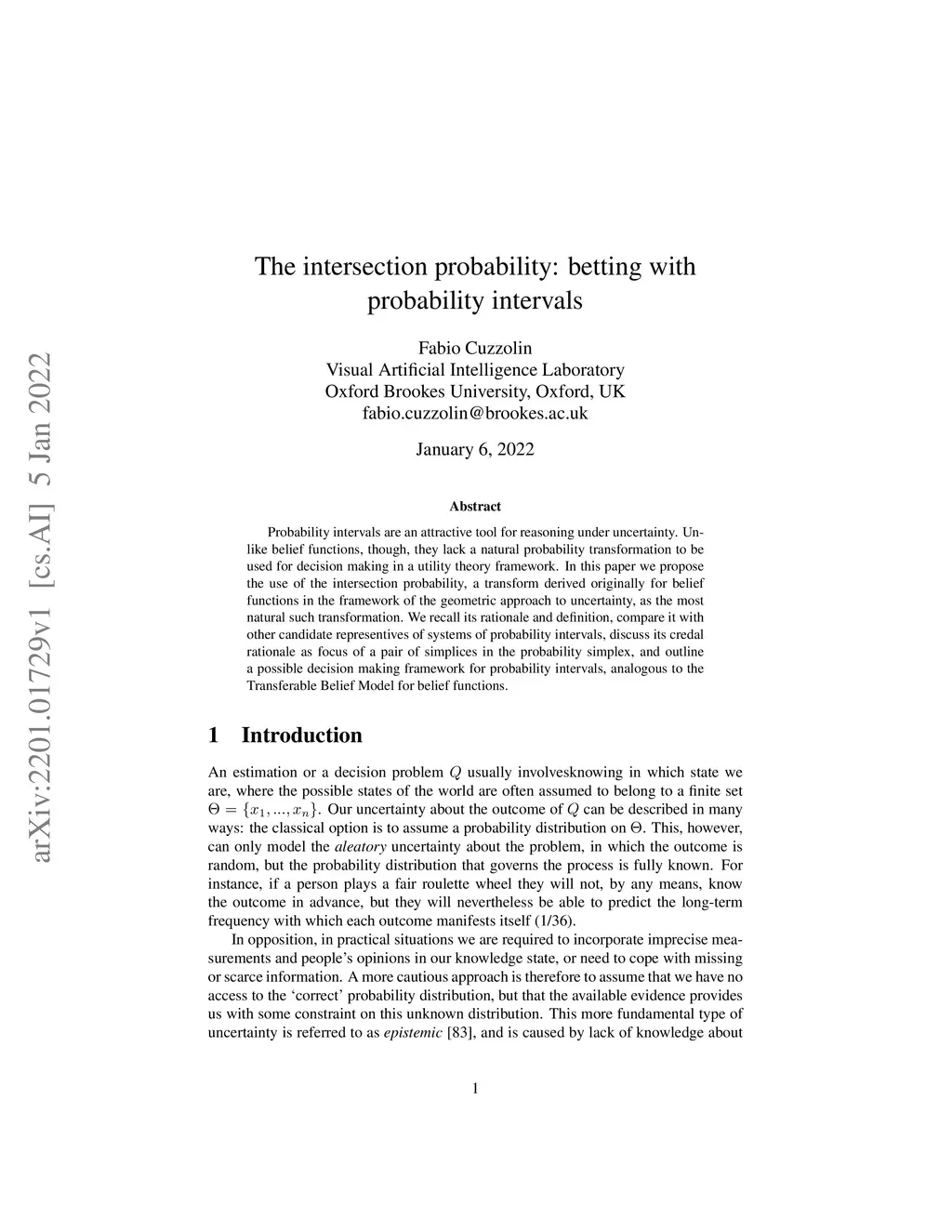 The intersection probability: betting with probability intervals