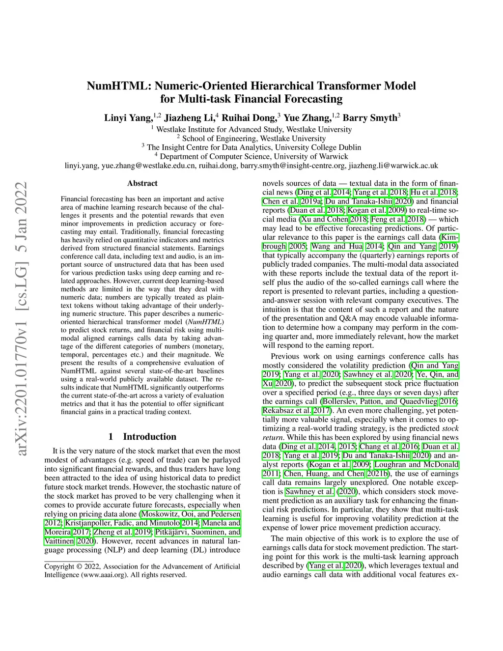 Financial forecasting has been an important and active area of machine learning research because of the challenges it presents and the potential rewards that even minor improvements in prediction accuracy or forecasting may entail. Traditionally, financial forecasting has heavily relied on quantitative indicators and metrics derived from structured financial statements. Earnings conference call data, including text and audio, is an important source of unstructured data that has been used for various prediction tasks using deep earning and related approaches. However, current deep learning-based methods are limited in the way that they deal with numeric data; numbers are typically treated as plain-text tokens without taking advantage of their underlying numeric structure. This paper describes a numeric-oriented hierarchical transformer model to predict stock returns, and financial risk using multi-modal aligned earnings calls data by taking advantage of the different categories of numbers (monetary, temporal, percentages etc.) and their magnitude. We present the results of a comprehensive evaluation of NumHTML against several state-of-the-art baselines using a real-world publicly available dataset. The results indicate that NumHTML significantly outperforms the current state-of-the-art across a variety of evaluation metrics and that it has the potential to offer significant financial gains in a practical trading context.
