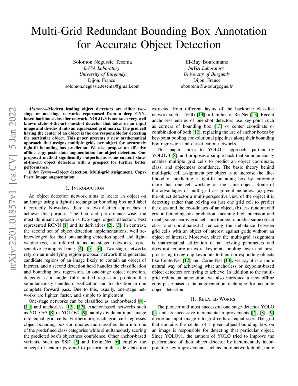 Modern leading object detectors are either two-stage or one-stage networks repurposed from a deep CNN-based backbone classifier network. YOLOv3 is one such very-well known state-of-the-art one-shot detector that takes in an input image and divides it into an equal-sized grid matrix. The grid cell having the center of an object is the one responsible for detecting the particular object. This paper presents a new mathematical approach that assigns multiple grids per object for accurately tight-fit bounding box prediction. We also propose an effective offline copy-paste data augmentation for object detection. Our proposed method significantly outperforms some current state-of-the-art object detectors with a prospect for further better performance.