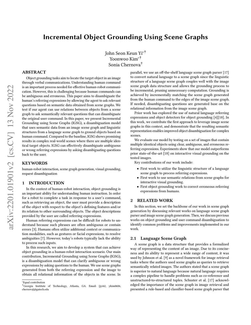 Object grounding tasks aim to locate the target object in an image through verbal communications. Understanding human command is an important process needed for effective human-robot communication. However, this is challenging because human commands can be ambiguous and erroneous. This paper aims to disambiguate the human's referring expressions by allowing the agent to ask relevant questions based on semantic data obtained from scene graphs. We test if our agent can use relations between objects from a scene graph to ask semantically relevant questions that can disambiguate the original user command. In this paper, we present Incremental Grounding using Scene Graphs (IGSG), a disambiguation model that uses semantic data from an image scene graph and linguistic structures from a language scene graph to ground objects based on human command. Compared to the baseline, IGSG shows promising results in complex real-world scenes where there are multiple identical target objects. IGSG can effectively disambiguate ambiguous or wrong referring expressions by asking disambiguating questions back to the user.