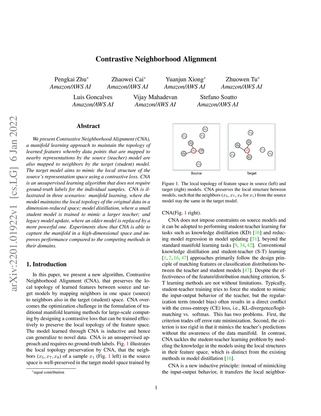 We present Contrastive Neighborhood Alignment (CNA), a manifold learning approach to maintain the topology of learned features whereby data points that are mapped to nearby representations by the source (teacher) model are also mapped to neighbors by the target (student) model. The target model aims to mimic the local structure of the source representation space using a contrastive loss. CNA is an unsupervised learning algorithm that does not require ground-truth labels for the individual samples. CNA is illustrated in three scenarios: manifold learning, where the model maintains the local topology of the original data in a dimension-reduced space; model distillation, where a small student model is trained to mimic a larger teacher; and legacy model update, where an older model is replaced by a more powerful one. Experiments show that CNA is able to capture the manifold in a high-dimensional space and improves performance compared to the competing methods in their domains.