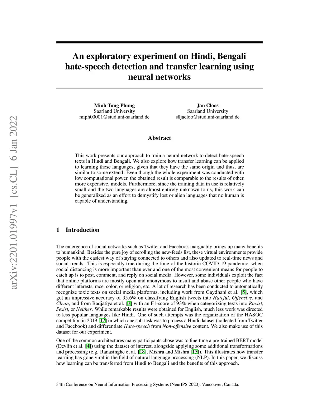 This work presents our approach to train a neural network to detect hate-speech texts in Hindi and Bengali. We also explore how transfer learning can be applied to learning these languages, given that they have the same origin and thus, are similar to some extend. Even though the whole experiment was conducted with low computational power, the obtained result is comparable to the results of other, more expensive, models. Furthermore, since the training data in use is relatively small and the two languages are almost entirely unknown to us, this work can be generalized as an effort to demystify lost or alien languages that no human is capable of understanding.