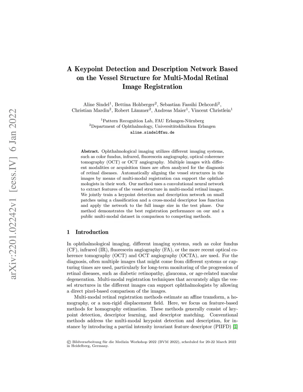 Ophthalmological imaging utilizes different imaging systems, such as color fundus, infrared, fluorescein angiography, optical coherence tomography (OCT) or OCT angiography. Multiple images with different modalities or acquisition times are often analyzed for the diagnosis of retinal diseases. Automatically aligning the vessel structures in the images by means of multi-modal registration can support the ophthalmologists in their work. Our method uses a convolutional neural network to extract features of the vessel structure in multi-modal retinal images. We jointly train a keypoint detection and description network on small patches using a classification and a cross-modal descriptor loss function and apply the network to the full image size in the test phase. Our method demonstrates the best registration performance on our and a public multi-modal dataset in comparison to competing methods.