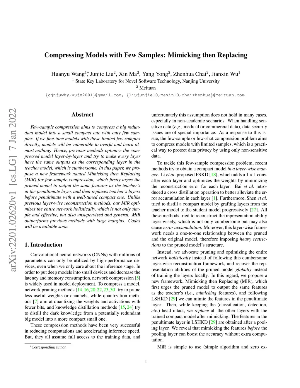 Few-sample compression aims to compress a big redundant model into a small compact one with only few samples. If we fine-tune models with these limited few samples directly, models will be vulnerable to overfit and learn almost nothing. Hence, previous methods optimize the compressed model layer-by-layer and try to make every layer have the same outputs as the corresponding layer in the teacher model, which is cumbersome. In this paper, we propose a new framework named Mimicking then Replacing (MiR) for few-sample compression, which firstly urges the pruned model to output the same features as the teacher's in the penultimate layer, and then replaces teacher's layers before penultimate with a well-tuned compact one. Unlike previous layer-wise reconstruction methods, our MiR optimizes the entire network holistically, which is not only simple and effective, but also unsupervised and general. MiR outperforms previous methods with large margins. Codes will be available soon.