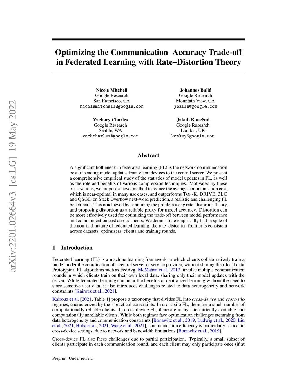 A significant bottleneck in federated learning (FL) is the network communication cost of sending model updates from client devices to the central server. We present a comprehensive empirical study of the statistics of model updates in FL, as well as the role and benefits of various compression techniques. Motivated by these observations, we propose a novel method to reduce the average communication cost, which is near-optimal in many use cases, and outperforms Top-K, DRIVE, 3LC and QSGD on Stack Overflow next-word prediction, a realistic and challenging FL benchmark. This is achieved by examining the problem using rate-distortion theory, and proposing distortion as a reliable proxy for model accuracy. Distortion can be more effectively used for optimizing the trade-off between model performance and communication cost across clients. We demonstrate empirically that in spite of the non-i.i.d. nature of federated learning, the rate-distortion frontier is consistent across datasets, optimizers, clients and training rounds.