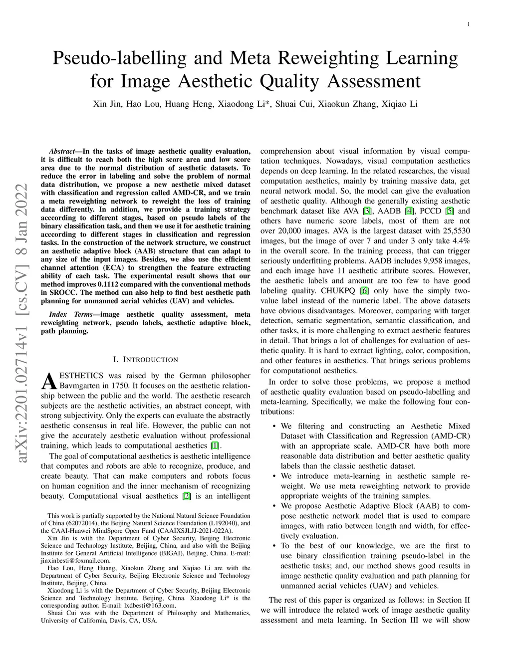In the tasks of image aesthetic quality evaluation, it is difficult to reach both the high score area and low score area due to the normal distribution of aesthetic datasets. To reduce the error in labeling and solve the problem of normal data distribution, we propose a new aesthetic mixed dataset with classification and regression called AMD-CR, and we train a meta reweighting network to reweight the loss of training data differently. In addition, we provide a training strategy acccording to different stages, based on pseudo labels of the binary classification task, and then we use it for aesthetic training acccording to different stages in classification and regression tasks. In the construction of the network structure, we construct an aesthetic adaptive block (AAB) structure that can adapt to any size of the input images. Besides, we also use the efficient channel attention (ECA) to strengthen the feature extracting ability of each task. The experimental result shows that our method improves 0.1112 compared with the conventional methods in SROCC. The method can also help to find best aesthetic path planning for unmanned aerial vehicles (UAV) and vehicles.