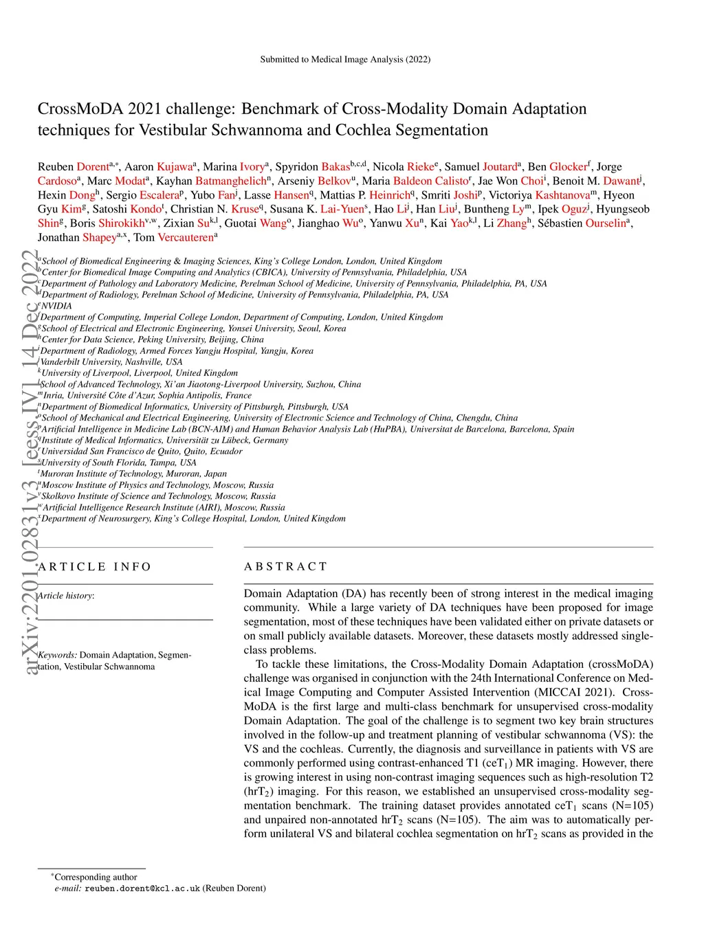 Domain Adaptation (DA) has recently raised strong interests in the medical imaging community. While a large variety of DA techniques has been proposed for image segmentation, most of these techniques have been validated either on private datasets or on small publicly available datasets. Moreover, these datasets mostly addressed single-class problems. To tackle these limitations, the Cross-Modality Domain Adaptation (crossMoDA) challenge was organised in conjunction with the 24th International Conference on Medical Image Computing and Computer Assisted Intervention (MICCAI 2021). CrossMoDA is the first large and multi-class benchmark for unsupervised cross-modality DA. The challenge's goal is to segment two key brain structures involved in the follow-up and treatment planning of vestibular schwannoma (VS): the VS and the cochleas. Currently, the diagnosis and surveillance in patients with VS are performed using contrast-enhanced T1 (ceT1) MRI. However, there is growing interest in using non-contrast sequences such as high-resolution T2 (hrT2) MRI. Therefore, we created an unsupervised cross-modality segmentation benchmark. The training set provides annotated ceT1 (N=105) and unpaired non-annotated hrT2 (N=105). The aim was to automatically perform unilateral VS and bilateral cochlea segmentation on hrT2 as provided in the testing set (N=137). A total of 16 teams submitted their algorithm for the evaluation phase. The level of performance reached by the top-performing teams is strikingly high (best median Dice - VS:88.4%; Cochleas:85.7%) and close to full supervision (median Dice - VS:92.5%; Cochleas:87.7%). All top-performing methods made use of an image-to-image translation approach to transform the source-domain images into pseudo-target-domain images. A segmentation network was then trained using these generated images and the manual annotations provided for the source image.