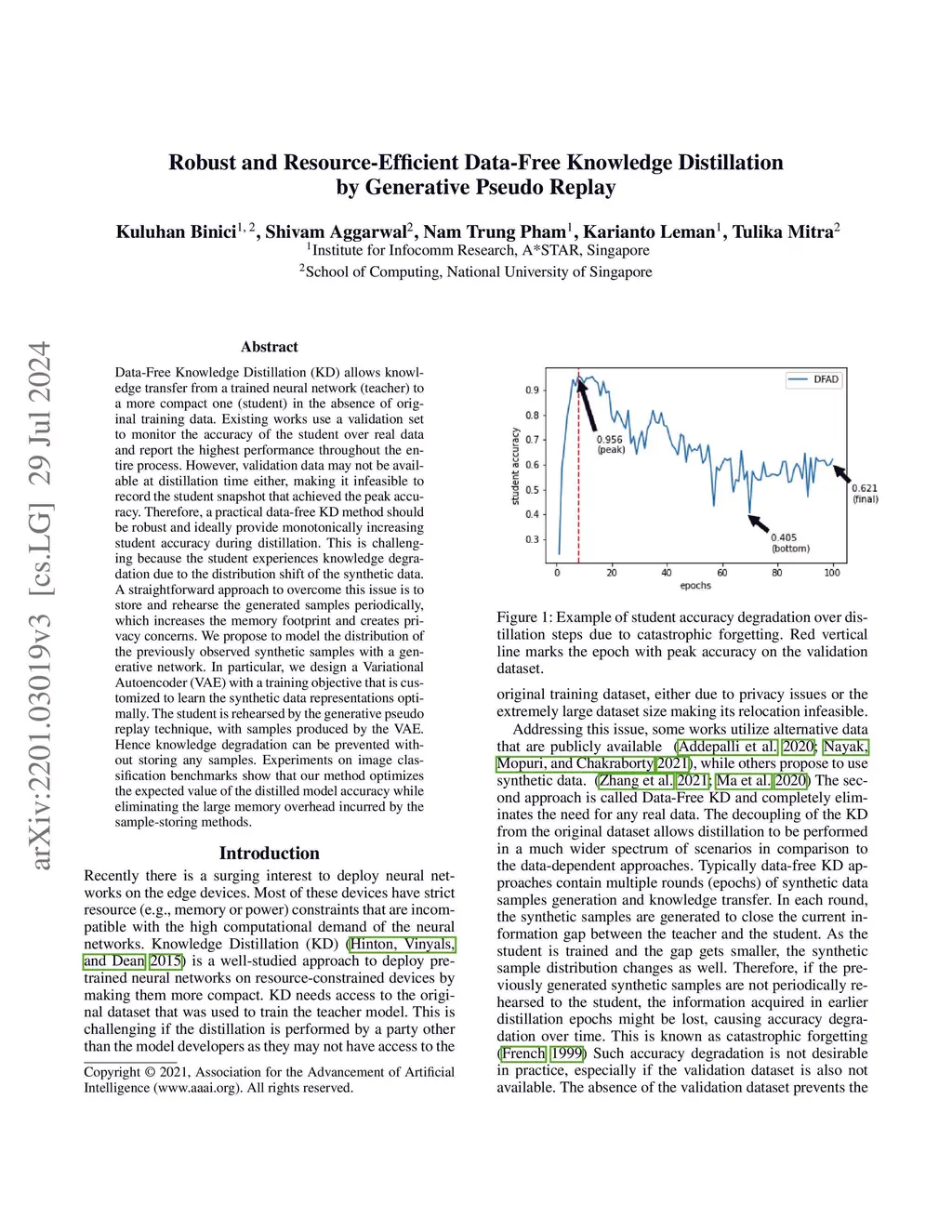 Data-Free Knowledge Distillation (KD) allows knowledge transfer from a trained neural network (teacher) to a more compact one (student) in the absence of original training data. Existing works use a validation set to monitor the accuracy of the student over real data and report the highest performance throughout the entire process. However, validation data may not be available at distillation time either, making it infeasible to record the student snapshot that achieved the peak accuracy. Therefore, a practical data-free KD method should be robust and ideally provide monotonically increasing student accuracy during distillation. This is challenging because the student experiences knowledge degradation due to the distribution shift of the synthetic data. A straightforward approach to overcome this issue is to store and rehearse the generated samples periodically, which increases the memory footprint and creates privacy concerns. We propose to model the distribution of the previously observed synthetic samples with a generative network. In particular, we design a Variational Autoencoder (VAE) with a training objective that is customized to learn the synthetic data representations optimally. The student is rehearsed by the generative pseudo replay technique, with samples produced by the VAE. Hence knowledge degradation can be prevented without storing any samples. Experiments on image classification benchmarks show that our method optimizes the expected value of the distilled model accuracy while eliminating the large memory overhead incurred by the sample-storing methods.