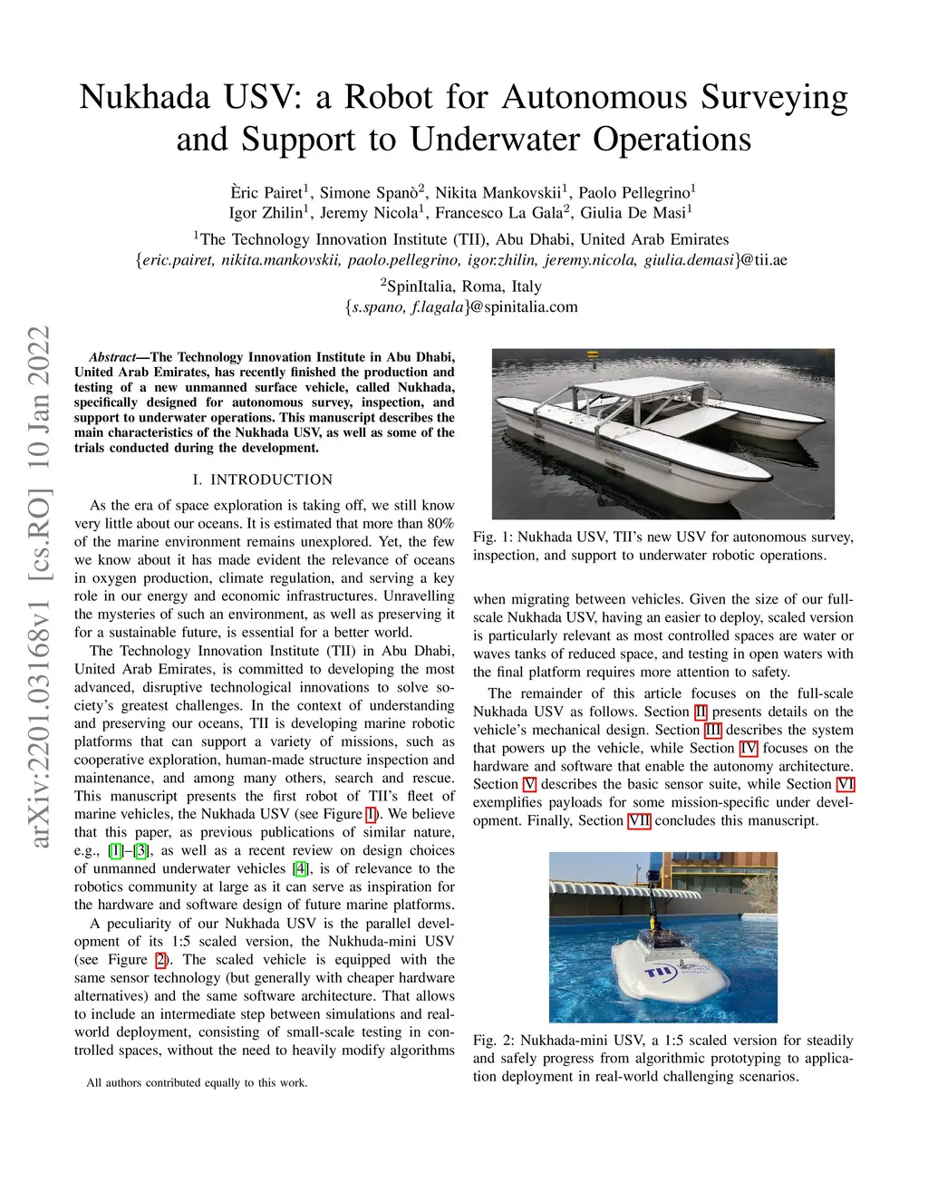 The Technology Innovation Institute in Abu Dhabi, United Arab Emirates, has recently finished the production and testing of a new unmanned surface vehicle, called Nukhada, specifically designed for autonomous survey, inspection, and support to underwater operations. This manuscript describes the main characteristics of the Nukhada USV, as well as some of the trials conducted during the development.