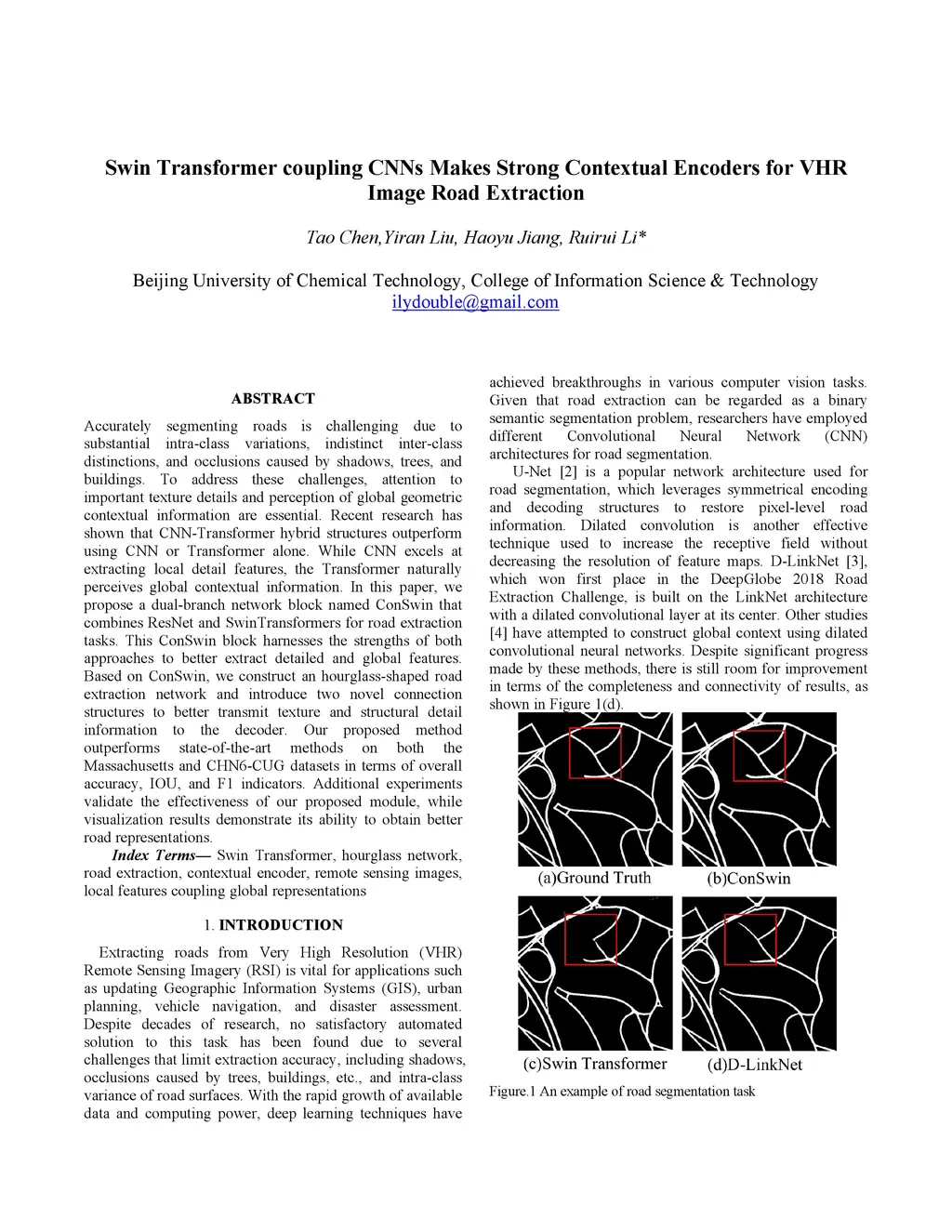 Accurately segmenting roads is challenging due to substantial intra-class variations, indistinct inter-class distinctions, and occlusions caused by shadows, trees, and buildings. To address these challenges, attention to important texture details and perception of global geometric contextual information are essential. Recent research has shown that CNN-Transformer hybrid structures outperform using CNN or Transformer alone. While CNN excels at extracting local detail features, the Transformer naturally perceives global contextual information. In this paper, we propose a dual-branch network block named ConSwin that combines ResNet and SwinTransformers for road extraction tasks. This ConSwin block harnesses the strengths of both approaches to better extract detailed and global features. Based on ConSwin, we construct an hourglass-shaped road extraction network and introduce two novel connection structures to better transmit texture and structural detail information to the decoder. Our proposed method outperforms state-of-the-art methods on both the Massachusetts and CHN6-CUG datasets in terms of overall accuracy, IOU, and F1 indicators. Additional experiments validate the effectiveness of our proposed module, while visualization results demonstrate its ability to obtain better road representations.
