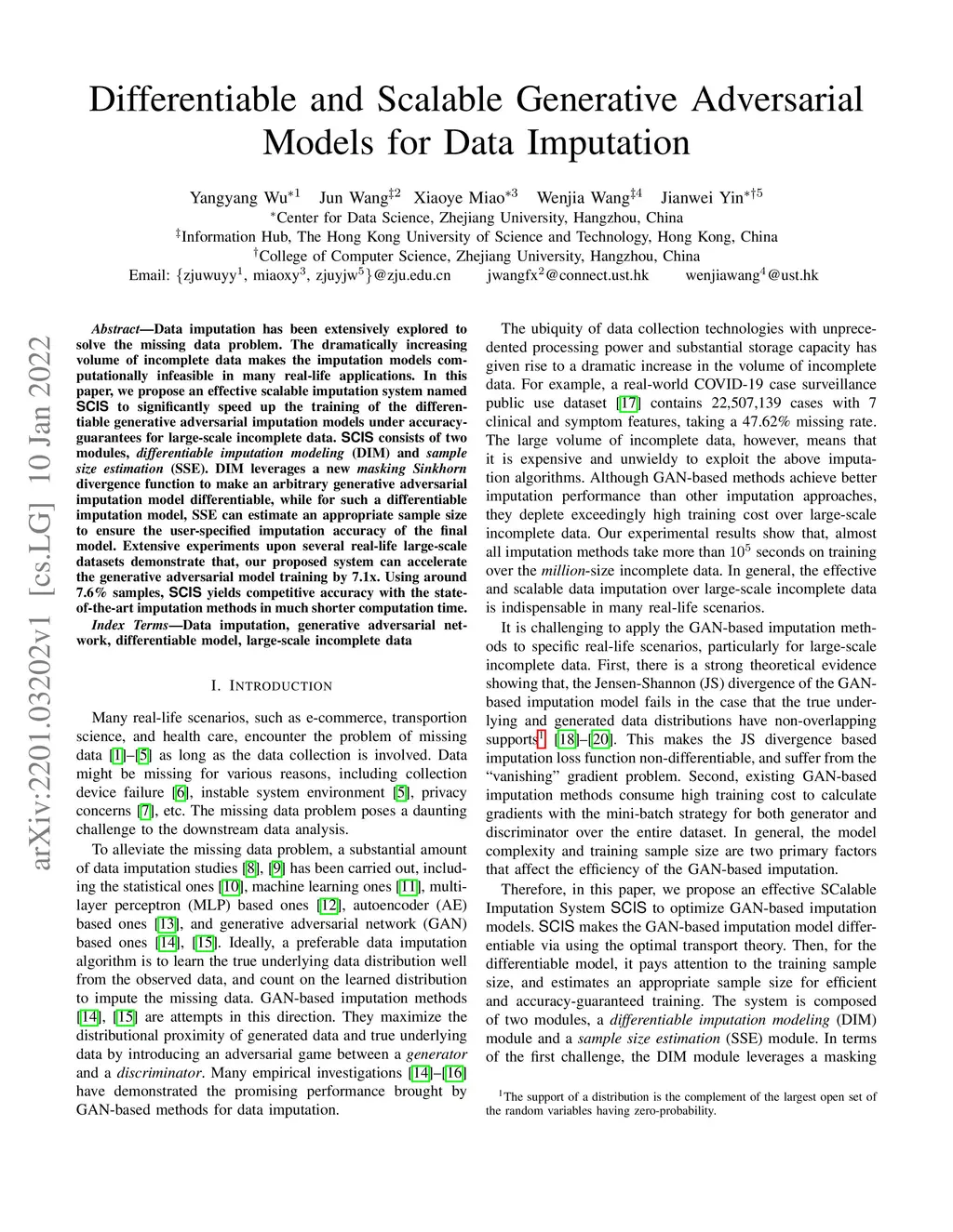 Data imputation has been extensively explored to solve the missing data problem. The dramatically increasing volume of incomplete data makes the imputation models computationally infeasible in many real-life applications. In this paper, we propose an effective scalable imputation system named SCIS to significantly speed up the training of the differentiable generative adversarial imputation models under accuracy-guarantees for large-scale incomplete data. SCIS consists of two modules, differentiable imputation modeling (DIM) and sample size estimation (SSE). DIM leverages a new masking Sinkhorn divergence function to make an arbitrary generative adversarial imputation model differentiable, while for such a differentiable imputation model, SSE can estimate an appropriate sample size to ensure the user-specified imputation accuracy of the final model. Extensive experiments upon several real-life large-scale datasets demonstrate that, our proposed system can accelerate the generative adversarial model training by 7.1x. Using around 7.6% samples, SCIS yields competitive accuracy with the state-of-the-art imputation methods in a much shorter computation time.