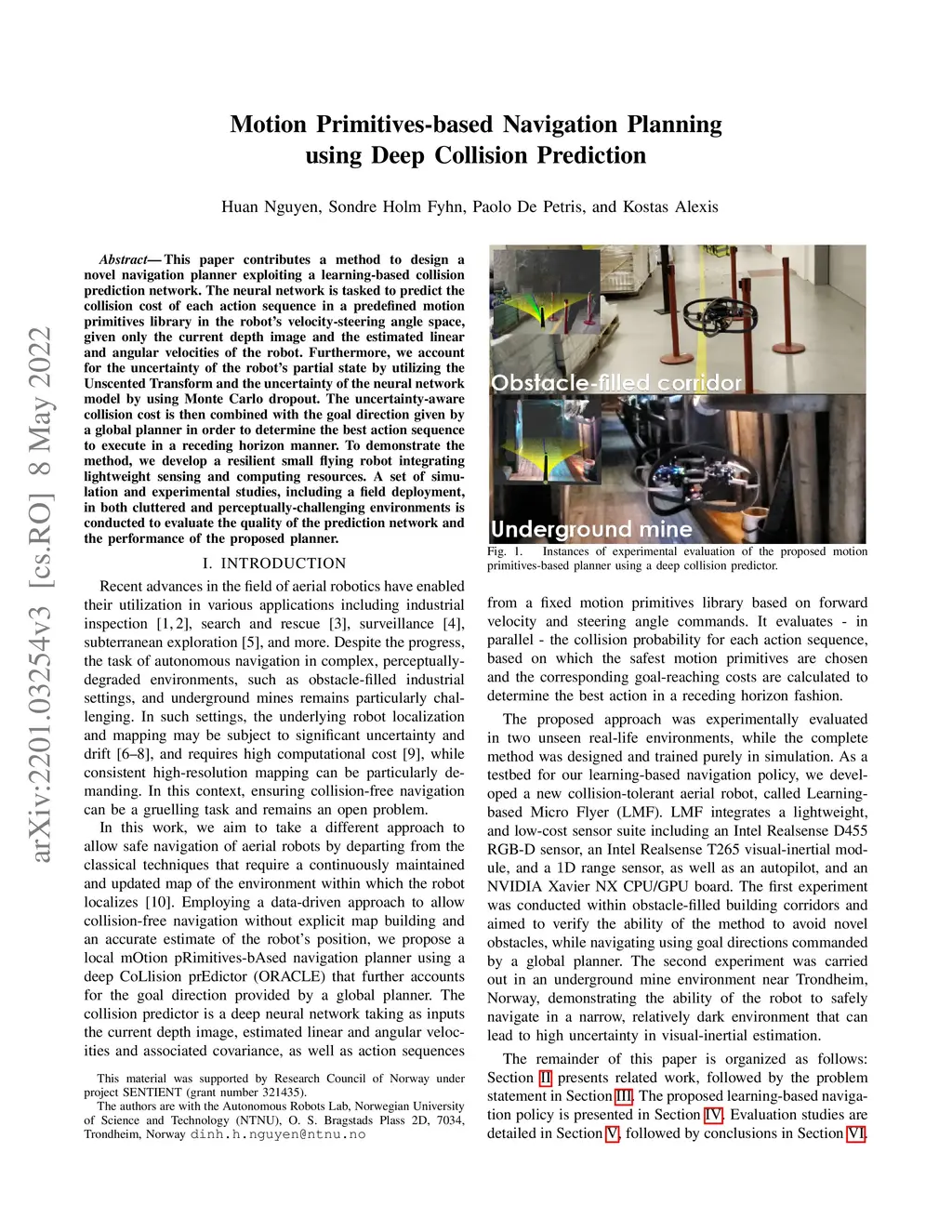 This paper contributes a method to design a novel navigation planner exploiting a learning-based collision prediction network. The neural network is tasked to predict the collision cost of each action sequence in a predefined motion primitives library in the robot's velocity-steering angle space, given only the current depth image and the estimated linear and angular velocities of the robot. Furthermore, we account for the uncertainty of the robot's partial state by utilizing the Unscented Transform and the uncertainty of the neural network model by using Monte Carlo dropout. The uncertainty-aware collision cost is then combined with the goal direction given by a global planner in order to determine the best action sequence to execute in a receding horizon manner. To demonstrate the method, we develop a resilient small flying robot integrating lightweight sensing and computing resources. A set of simulation and experimental studies, including a field deployment, in both cluttered and perceptually-challenging environments is conducted to evaluate the quality of the prediction network and the performance of the proposed planner.