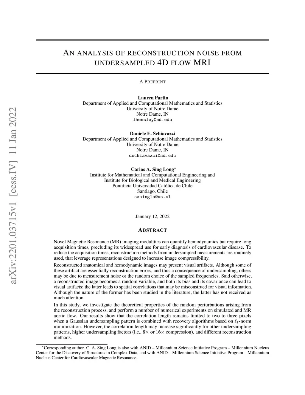 Novel Magnetic Resonance (MR) imaging modalities can quantify hemodynamics but require long acquisition times, precluding its widespread use for early diagnosis of cardiovascular disease. To reduce the acquisition times, reconstruction methods from undersampled measurements are routinely used, that leverage representations designed to increase image compressibility. Reconstructed anatomical and hemodynamic images may present visual artifacts. Although some of these artifact are essentially reconstruction errors, and thus a consequence of undersampling, others may be due to measurement noise or the random choice of the sampled frequencies. Said otherwise, a reconstructed image becomes a random variable, and both its bias and its covariance can lead to visual artifacts; the latter leads to spatial correlations that may be misconstrued for visual information. Although the nature of the former has been studied in the literature, the latter has not received as much attention. In this study, we investigate the theoretical properties of the random perturbations arising from the reconstruction process, and perform a number of numerical experiments on simulated and MR aortic flow. Our results show that the correlation length remains limited to two to three pixels when a Gaussian undersampling pattern is combined with recovery algorithms based on -norm minimization. However, the correlation length may increase significantly for other undersampling patterns, higher undersampling factors (i.e., 8x or 16x compression), and different reconstruction methods.