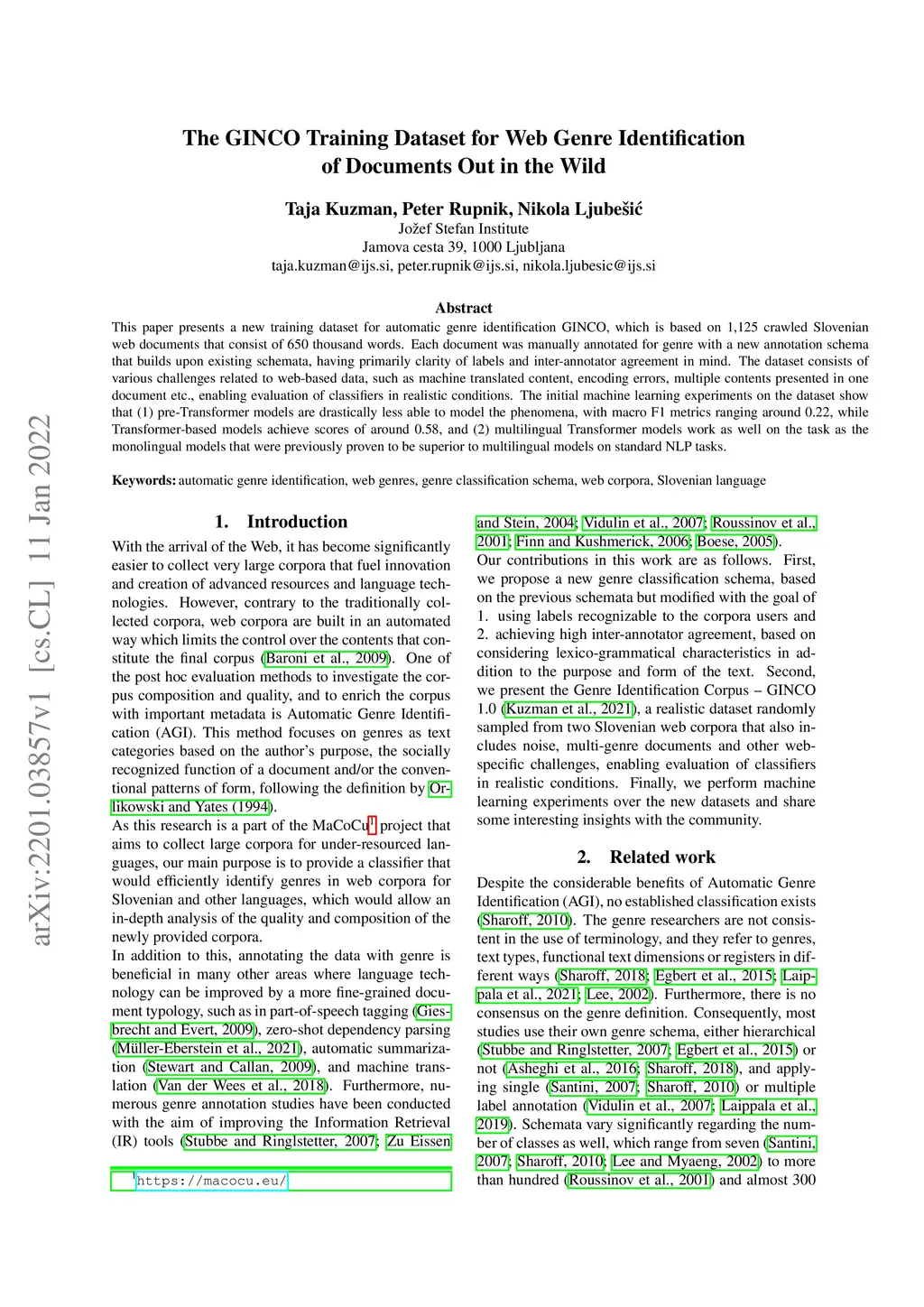The GINCO Training Dataset for Web Genre Identification of Documents Out