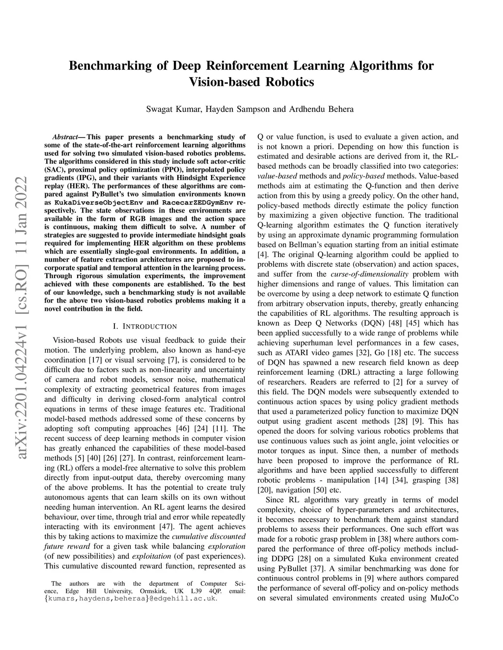 This paper presents a benchmarking study of some of the state-of-the-art reinforcement learning algorithms used for solving two simulated vision-based robotics problems. The algorithms considered in this study include soft actor-critic (SAC), proximal policy optimization (PPO), interpolated policy gradients (IPG), and their variants with Hindsight Experience replay (HER). The performances of these algorithms are compared against PyBullet's two simulation environments known as KukaDiverseObjectEnv and RacecarZEDGymEnv respectively. The state observations in these environments are available in the form of RGB images and the action space is continuous, making them difficult to solve. A number of strategies are suggested to provide intermediate hindsight goals required for implementing HER algorithm on these problems which are essentially single-goal environments. In addition, a number of feature extraction architectures are proposed to incorporate spatial and temporal attention in the learning process. Through rigorous simulation experiments, the improvement achieved with these components are established. To the best of our knowledge, such a benchmarking study is not available for the above two vision-based robotics problems making it a novel contribution in the field.