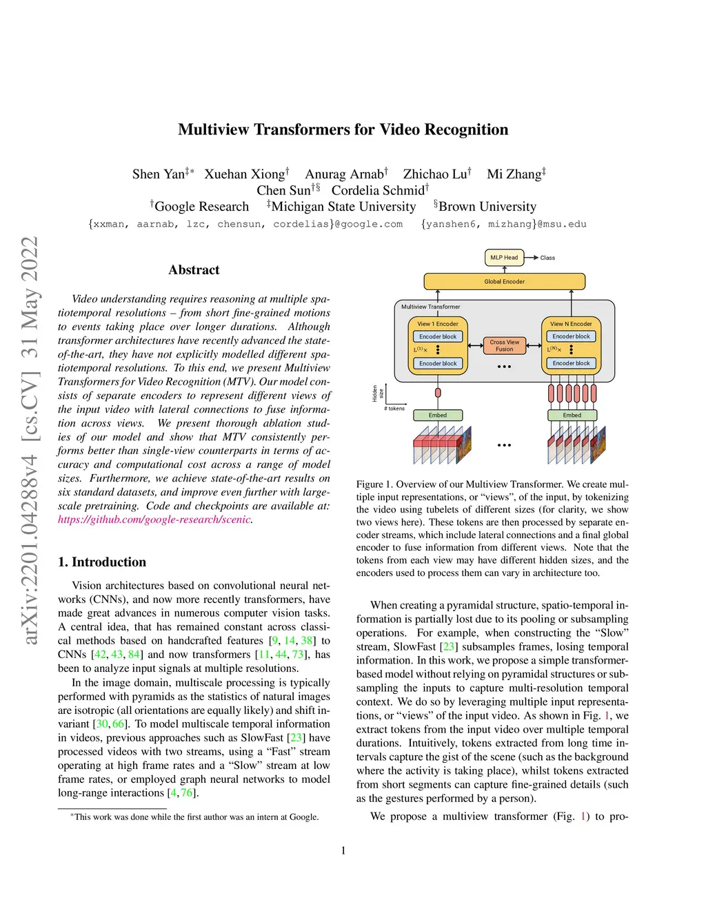 Video understanding requires reasoning at multiple spatiotemporal resolutions -- from short fine-grained motions to events taking place over longer durations. Although transformer architectures have recently advanced the state-of-the-art, they have not explicitly modelled different spatiotemporal resolutions. To this end, we present Multiview Transformers for Video Recognition (MTV). Our model consists of separate encoders to represent different views of the input video with lateral connections to fuse information across views. We present thorough ablation studies of our model and show that MTV consistently performs better than single-view counterparts in terms of accuracy and computational cost across a range of model sizes. Furthermore, we achieve state-of-the-art results on six standard datasets, and improve even further with large-scale pretraining. Code and checkpoints are available at: https://github.com/google-research/scenic/tree/main/scenic/projects/mtv.