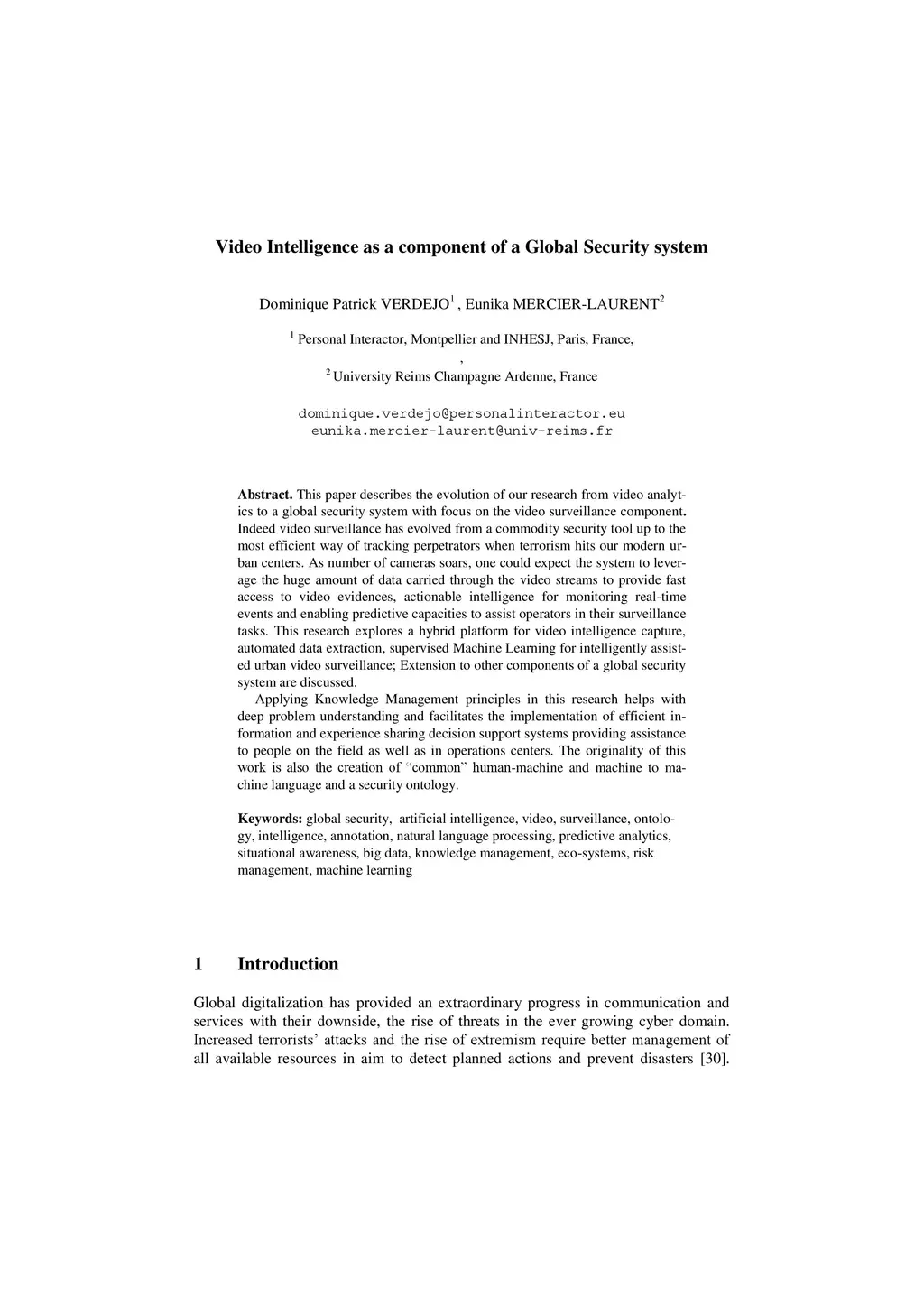 This paper describes the evolution of our research from video analytics to a global security system with focus on the video surveillance component. Indeed video surveillance has evolved from a commodity security tool up to the most efficient way of tracking perpetrators when terrorism hits our modern urban centers. As number of cameras soars, one could expect the system to leverage the huge amount of data carried through the video streams to provide fast access to video evidences, actionable intelligence for monitoring real-time events and enabling predictive capacities to assist operators in their surveillance tasks. This research explores a hybrid platform for video intelligence capture, automated data extraction, supervised Machine Learning for intelligently assisted urban video surveillance; Extension to other components of a global security system are discussed. Applying Knowledge Management principles in this research helps with deep problem understanding and facilitates the implementation of efficient information and experience sharing decision support systems providing assistance to people on the field as well as in operations centers. The originality of this work is also the creation of "common" human-machine and machine to machine language and a security ontology.