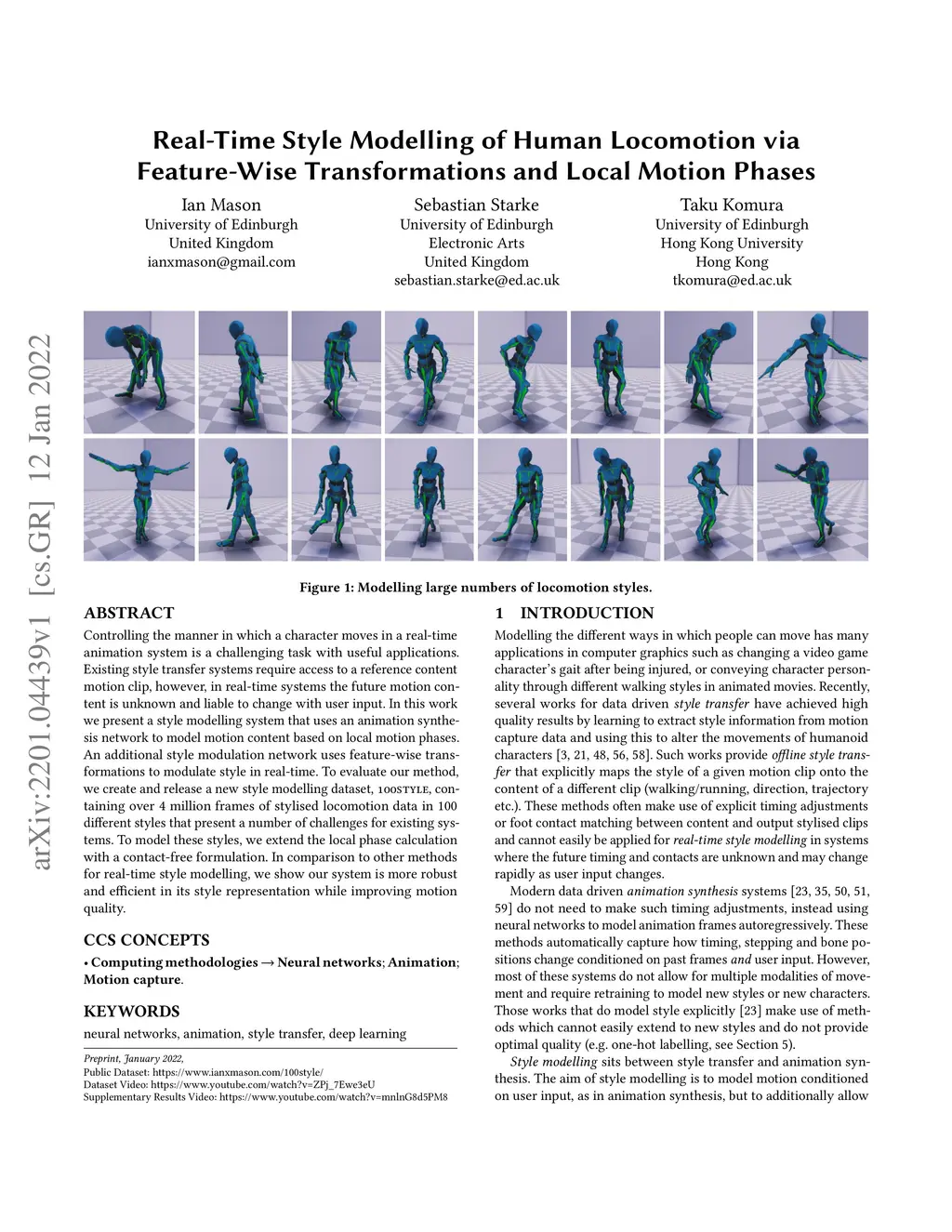 Controlling the manner in which a character moves in a real-time animation system is a challenging task with useful applications. Existing style transfer systems require access to a reference content motion clip, however, in real-time systems the future motion content is unknown and liable to change with user input. In this work we present a style modelling system that uses an animation synthesis network to model motion content based on local motion phases. An additional style modulation network uses feature-wise transformations to modulate style in real-time. To evaluate our method, we create and release a new style modelling dataset, 100STYLE, containing over 4 million frames of stylised locomotion data in 100 different styles that present a number of challenges for existing systems. To model these styles, we extend the local phase calculation with a contact-free formulation. In comparison to other methods for real-time style modelling, we show our system is more robust and efficient in its style representation while improving motion quality.