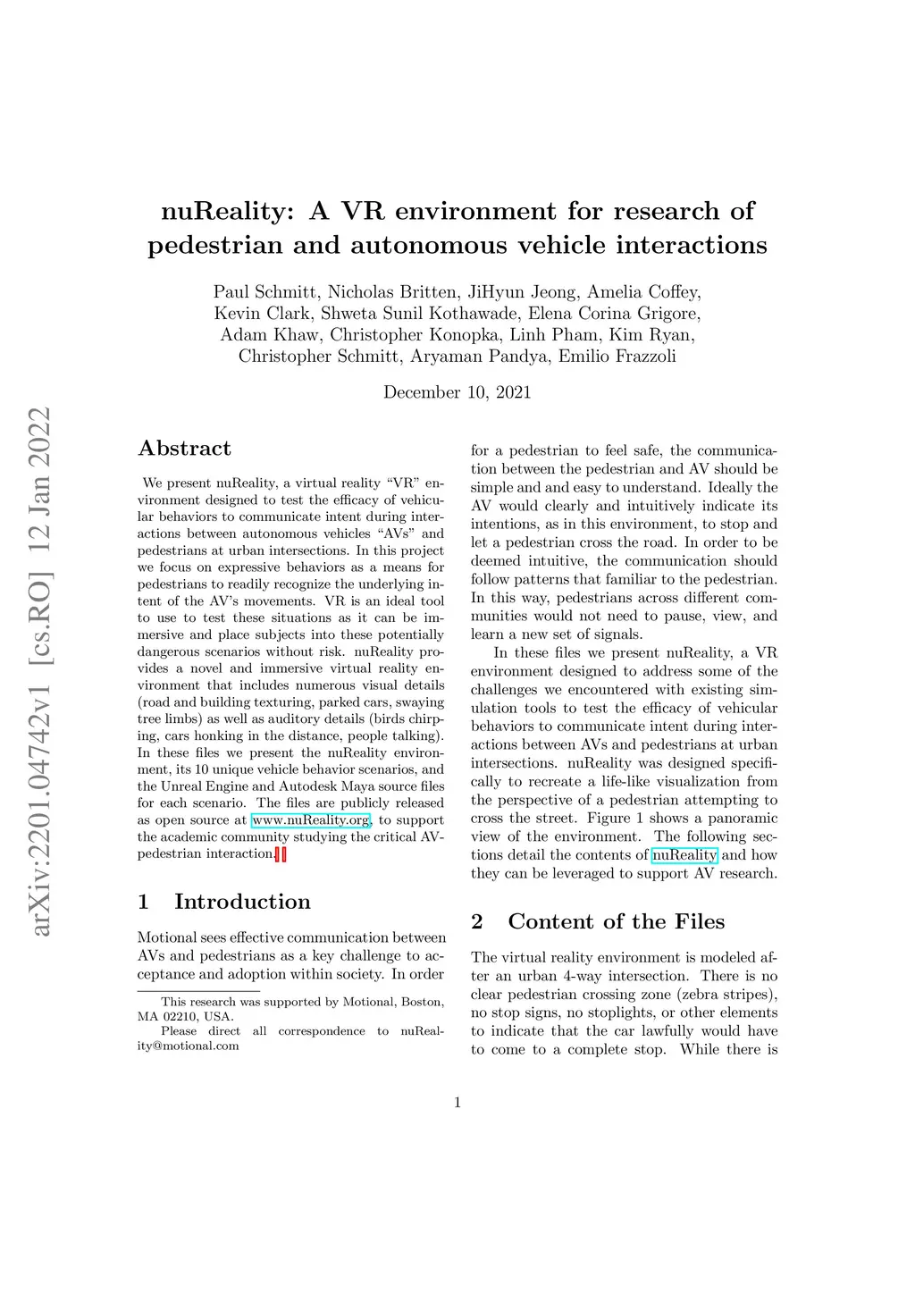 We present nuReality, a virtual reality 'VR' environment designed to test the efficacy of vehicular behaviors to communicate intent during interactions between autonomous vehicles ÁVs' and pedestrians at urban intersections. In this project we focus on expressive behaviors as a means for pedestrians to readily recognize the underlying intent of the AV's movements. VR is an ideal tool to use to test these situations as it can be immersive and place subjects into these potentially dangerous scenarios without risk. nuReality provides a novel and immersive virtual reality environment that includes numerous visual details (road and building texturing, parked cars, swaying tree limbs) as well as auditory details (birds chirping, cars honking in the distance, people talking). In these files we present the nuReality environment, its 10 unique vehicle behavior scenarios, and the Unreal Engine and Autodesk Maya source files for each scenario. The files are publicly released as open source at www.nuReality.org, to support the academic community studying the critical AV-pedestrian interaction.