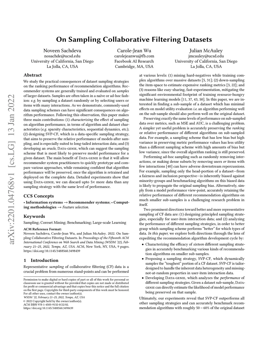 We study the practical consequences of dataset sampling strategies on the ranking performance of recommendation algorithms. Recommender systems are generally trained and evaluated on samples of larger datasets. Samples are often taken in a naive or ad-hoc fashion: e.g. by sampling a dataset randomly or by selecting users or items with many interactions. As we demonstrate, commonly-used data sampling schemes can have significant consequences on algorithm performance. Following this observation, this paper makes three main contributions: (1) characterizing the effect of sampling on algorithm performance, in terms of algorithm and dataset characteristics (e.g. sparsity characteristics, sequential dynamics, etc.); (2) designing SVP-CF, which is a data-specific sampling strategy, that aims to preserve the relative performance of models after sampling, and is especially suited to long-tailed interaction data; and (3) developing an oracle, Data-Genie, which can suggest the sampling scheme that is most likely to preserve model performance for a given dataset. The main benefit of Data-Genie is that it will allow recommender system practitioners to quickly prototype and compare various approaches, while remaining confident that algorithm performance will be preserved, once the algorithm is retrained and deployed on the complete data. Detailed experiments show that using Data-Genie, we can discard upto 5x more data than any sampling strategy with the same level of performance.