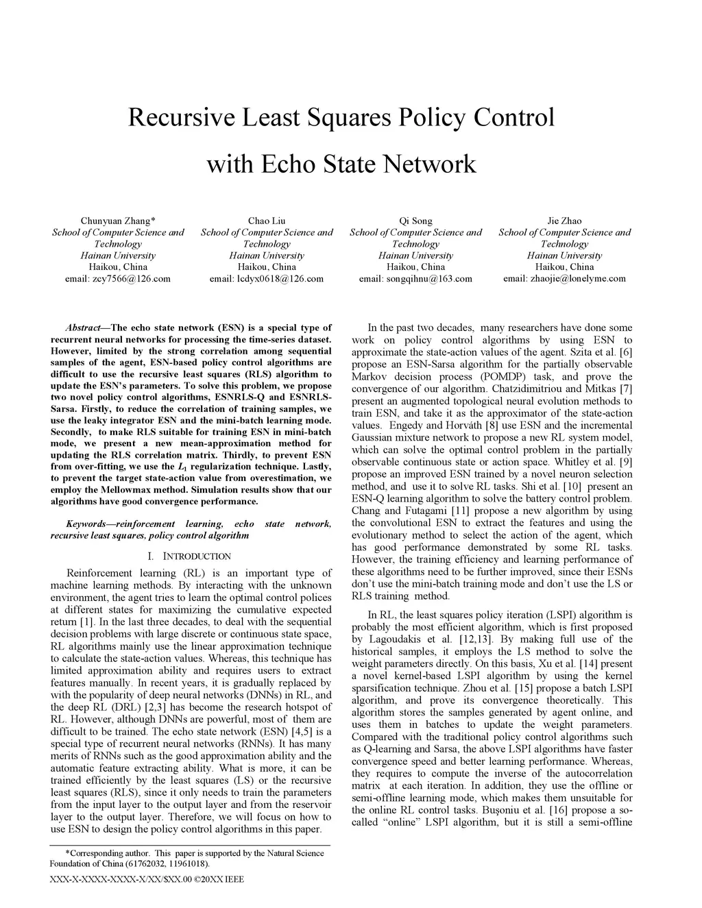 The echo state network (ESN) is a special type of recurrent neural networks for processing the time-series dataset. However, limited by the strong correlation among sequential samples of the agent, ESN-based policy control algorithms are difficult to use the recursive least squares (RLS) algorithm to update the ESN's parameters. To solve this problem, we propose two novel policy control algorithms, ESNRLS-Q and ESNRLS-Sarsa. Firstly, to reduce the correlation of training samples, we use the leaky integrator ESN and the mini-batch learning mode. Secondly, to make RLS suitable for training ESN in mini-batch mode, we present a new mean-approximation method for updating the RLS correlation matrix. Thirdly, to prevent ESN from over-fitting, we use the L1 regularization technique. Lastly, to prevent the target state-action value from overestimation, we employ the Mellowmax method. Simulation results show that our algorithms have good convergence performance.