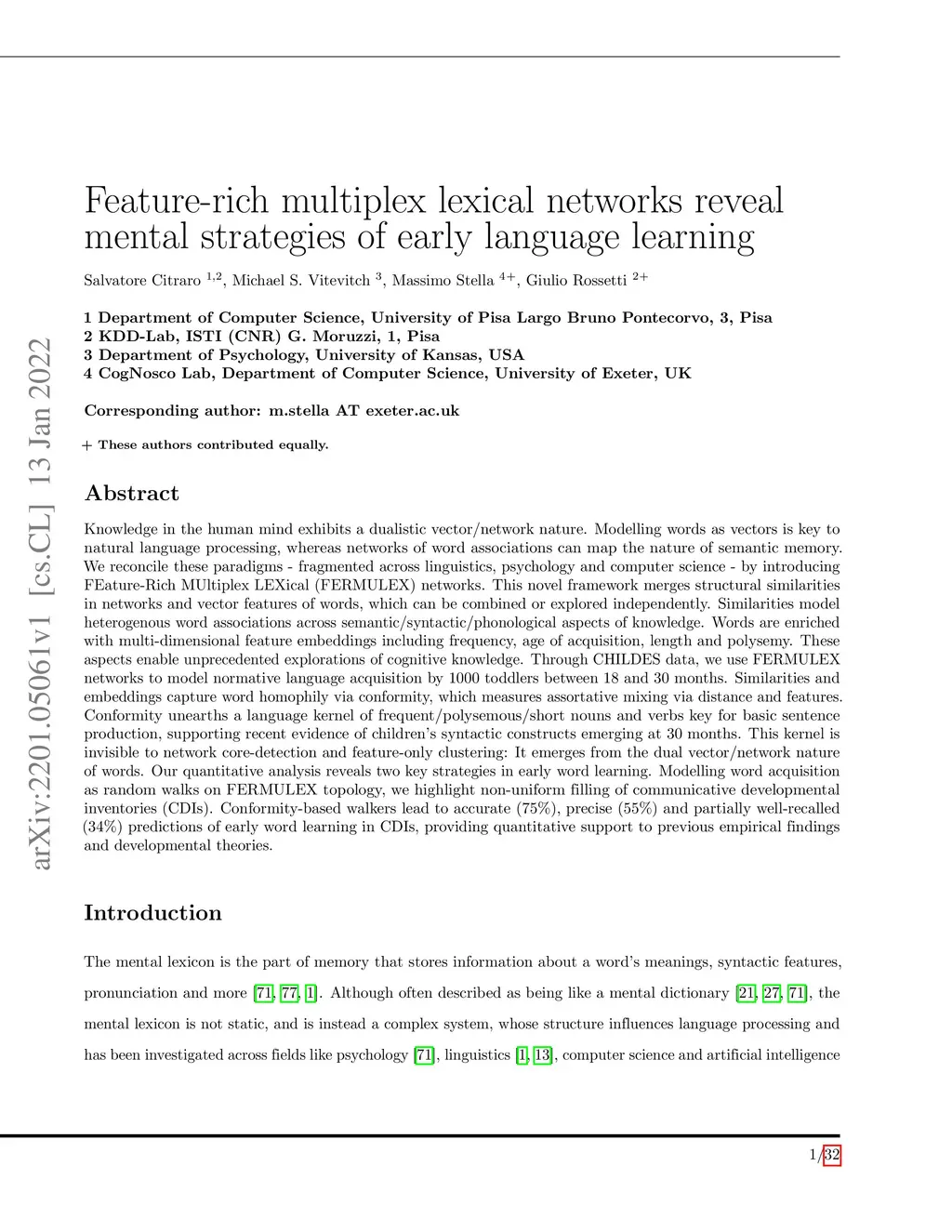 Knowledge in the human mind exhibits a dualistic vector/network nature. Modelling words as vectors is key to natural language processing, whereas networks of word associations can map the nature of semantic memory. We reconcile these paradigms - fragmented across linguistics, psychology and computer science - by introducing FEature-Rich MUltiplex LEXical (FERMULEX) networks. This novel framework merges structural similarities in networks and vector features of words, which can be combined or explored independently. Similarities model heterogenous word associations across semantic/syntactic/phonological aspects of knowledge. Words are enriched with multi-dimensional feature embeddings including frequency, age of acquisition, length and polysemy. These aspects enable unprecedented explorations of cognitive knowledge. Through CHILDES data, we use FERMULEX networks to model normative language acquisition by 1000 toddlers between 18 and 30 months. Similarities and embeddings capture word homophily via conformity, which measures assortative mixing via distance and features. Conformity unearths a language kernel of frequent/polysemous/short nouns and verbs key for basic sentence production, supporting recent evidence of children's syntactic constructs emerging at 30 months. This kernel is invisible to network core-detection and feature-only clustering: It emerges from the dual vector/network nature of words. Our quantitative analysis reveals two key strategies in early word learning. Modelling word acquisition as random walks on FERMULEX topology, we highlight non-uniform filling of communicative developmental inventories (CDIs). Conformity-based walkers lead to accurate (75%), precise (55%) and partially well-recalled (34%) predictions of early word learning in CDIs, providing quantitative support to previous empirical findings and developmental theories.