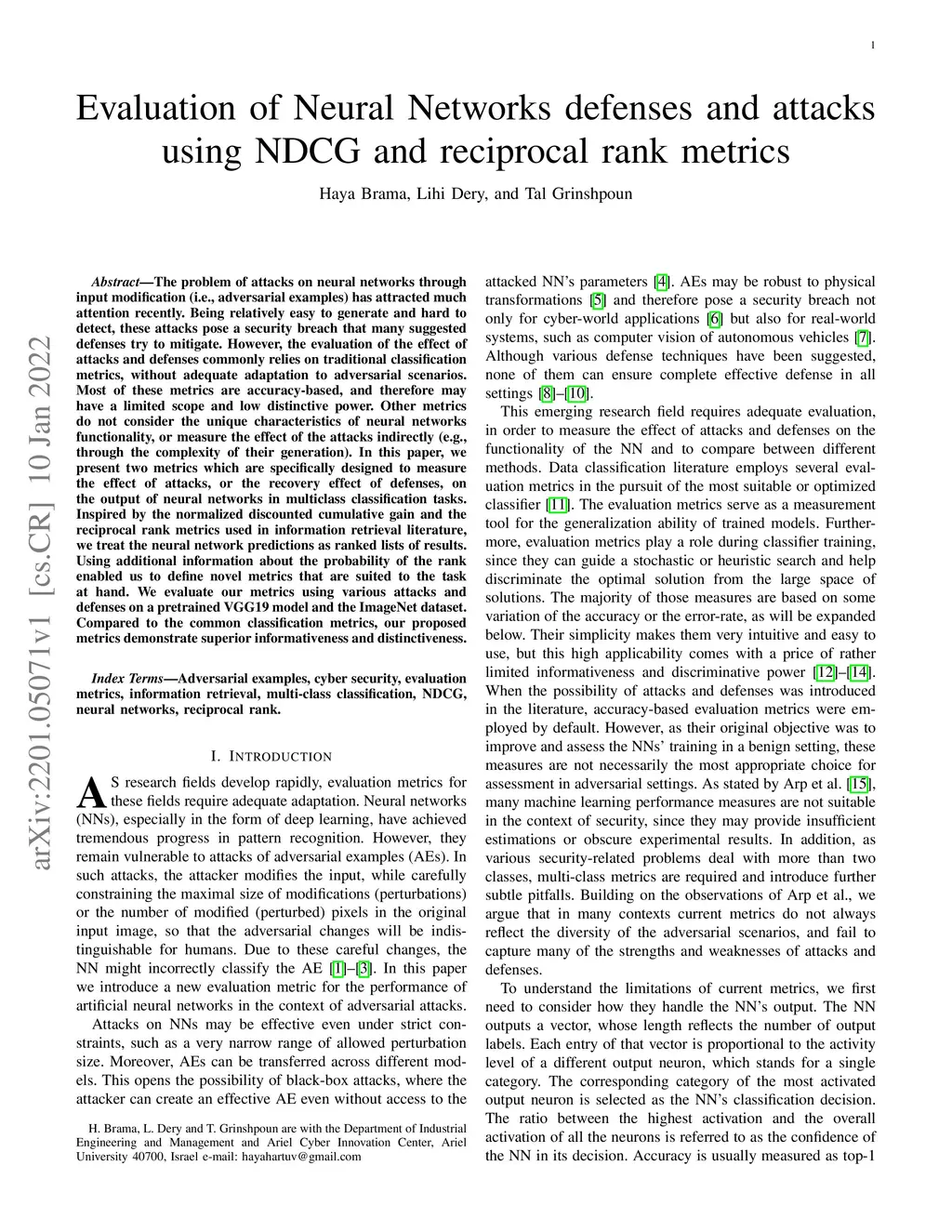 The problem of attacks on neural networks through input modification (i.e., adversarial examples) has attracted much attention recently. Being relatively easy to generate and hard to detect, these attacks pose a security breach that many suggested defenses try to mitigate. However, the evaluation of the effect of attacks and defenses commonly relies on traditional classification metrics, without adequate adaptation to adversarial scenarios. Most of these metrics are accuracy-based, and therefore may have a limited scope and low distinctive power. Other metrics do not consider the unique characteristics of neural networks functionality, or measure the effect of the attacks indirectly (e.g., through the complexity of their generation). In this paper, we present two metrics which are specifically designed to measure the effect of attacks, or the recovery effect of defenses, on the output of neural networks in multiclass classification tasks. Inspired by the normalized discounted cumulative gain and the reciprocal rank metrics used in information retrieval literature, we treat the neural network predictions as ranked lists of results. Using additional information about the probability of the rank enabled us to define novel metrics that are suited to the task at hand. We evaluate our metrics using various attacks and defenses on a pretrained VGG19 model and the ImageNet dataset. Compared to the common classification metrics, our proposed metrics demonstrate superior informativeness and distinctiveness.
